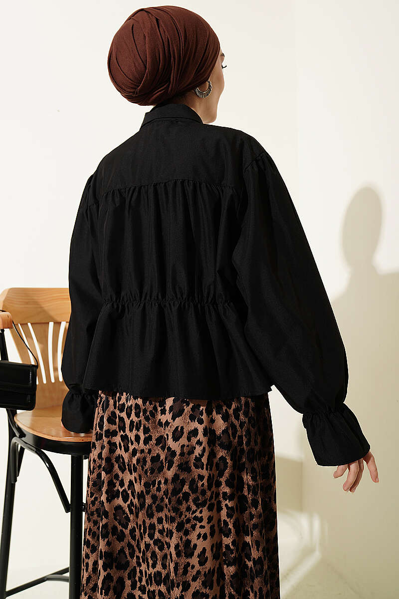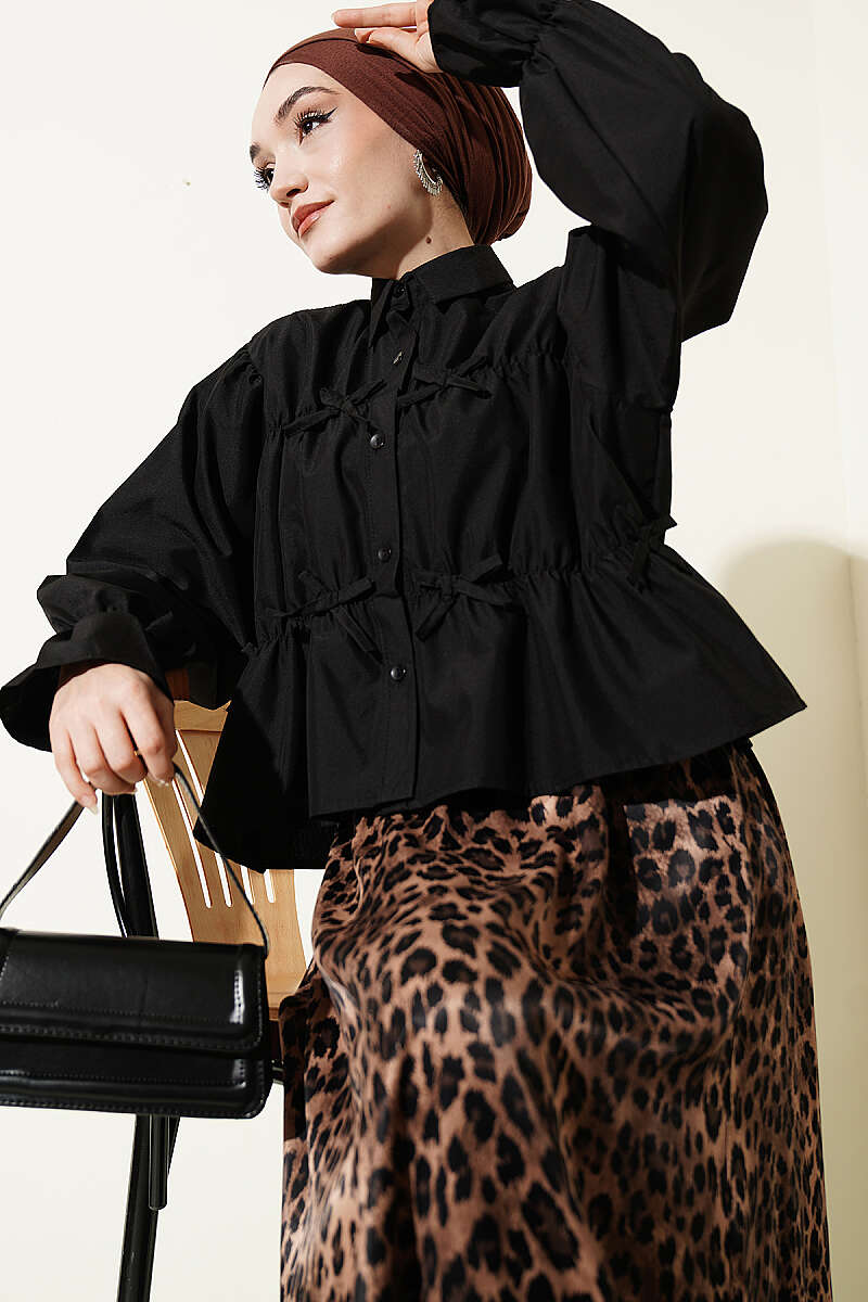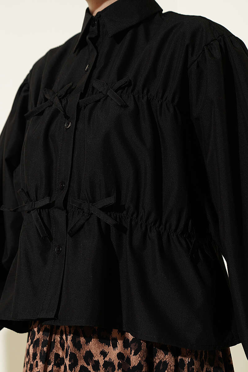 Büzgülü Fiyonklu Kısa Gömlek Siyah
