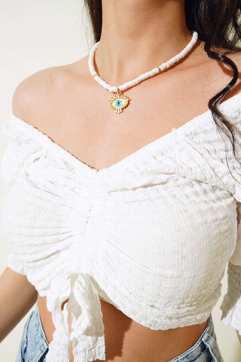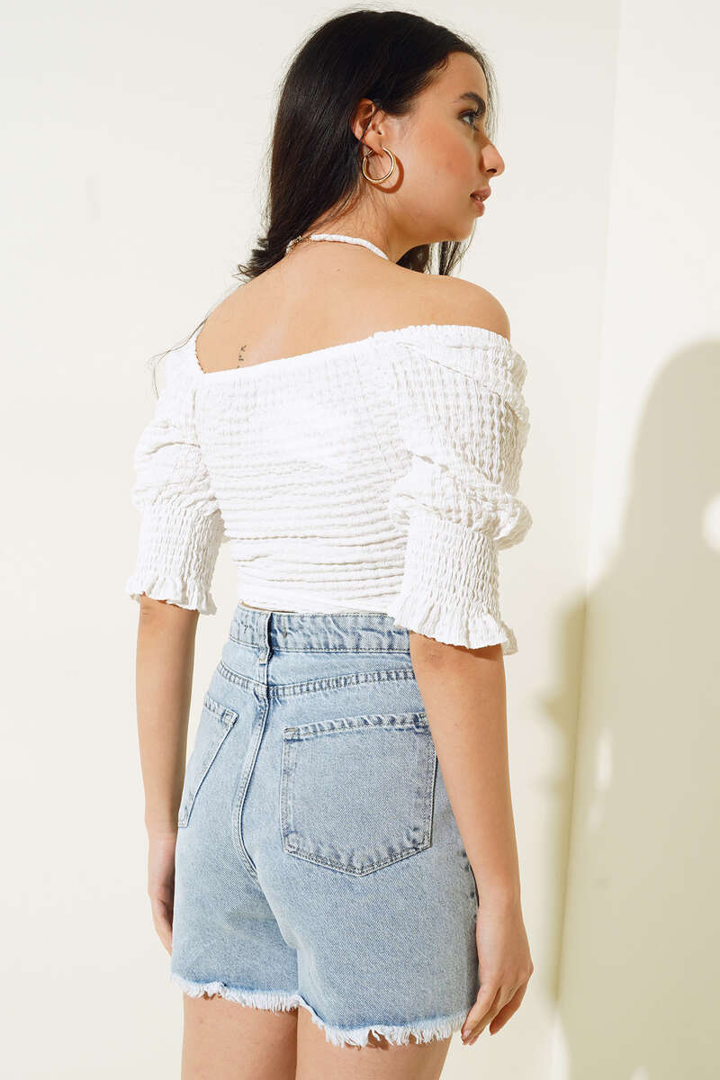 Yeni sezon gofre bluzumuz büzgülü bağlamasıyla bu yazın en şık modellerinden birisi olmuştur. Geniş yakalı olan bluzumuz tarzıyla kombinlerinizin tamamlayıcısı olacak. Bilekleri gipelidir.