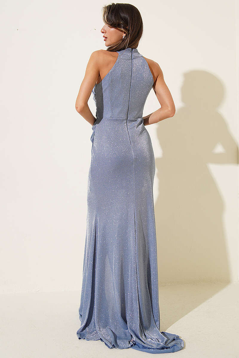 Büzgülü Simli Yırtmaçlı Abiye Elbise Bebe Mavi
