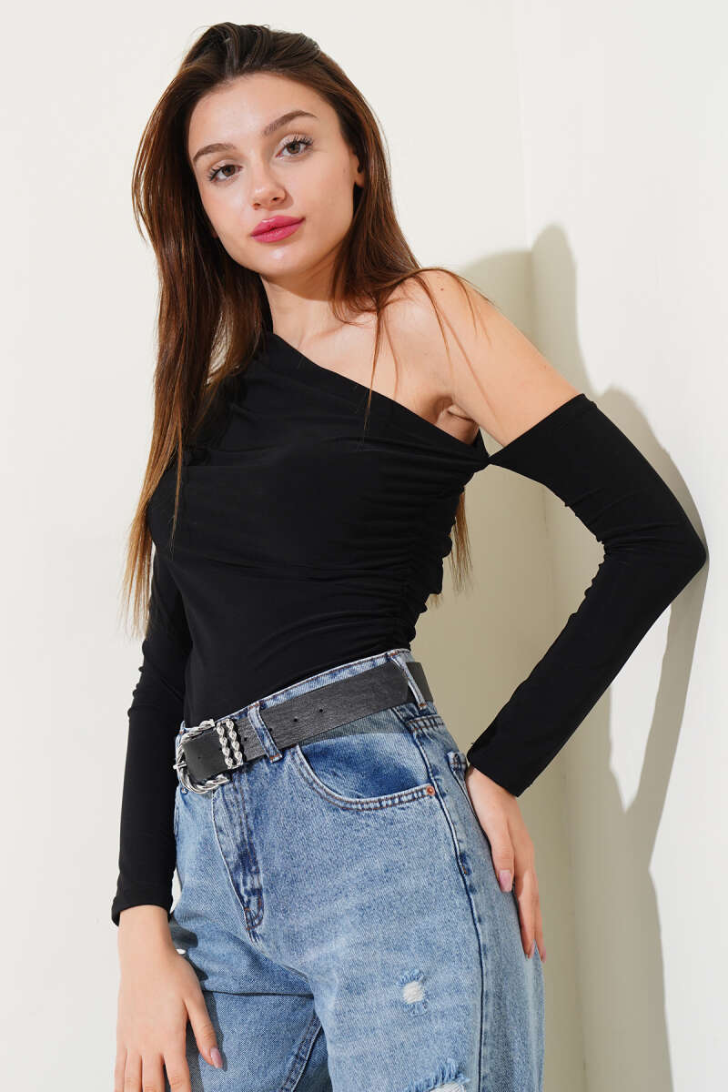 Peluş Yaka Kemerli Kaşe Panço Siyah
