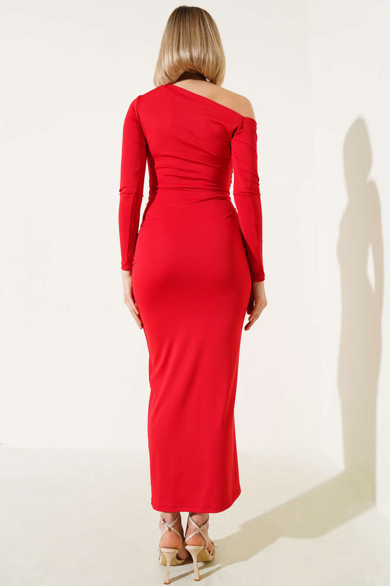 Büzgülü Yırtmaçlı Uzun Kol Elbise Kırmızı