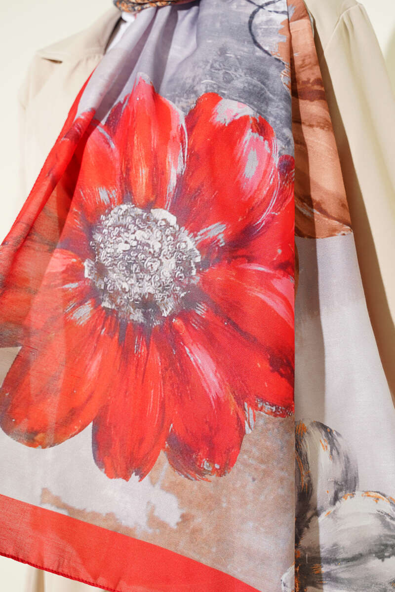 Mini Çiçek Detaylı Eşarp Gri