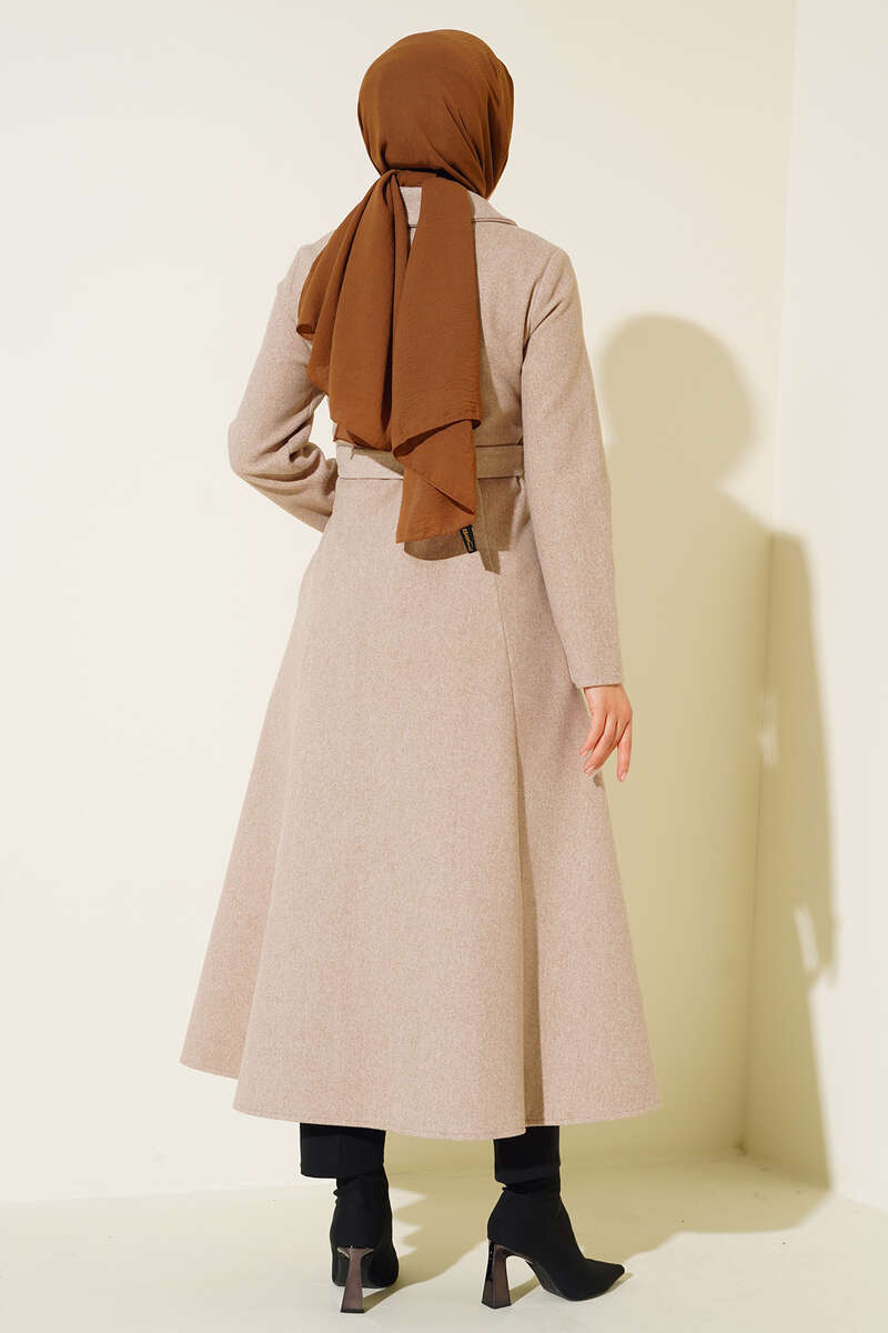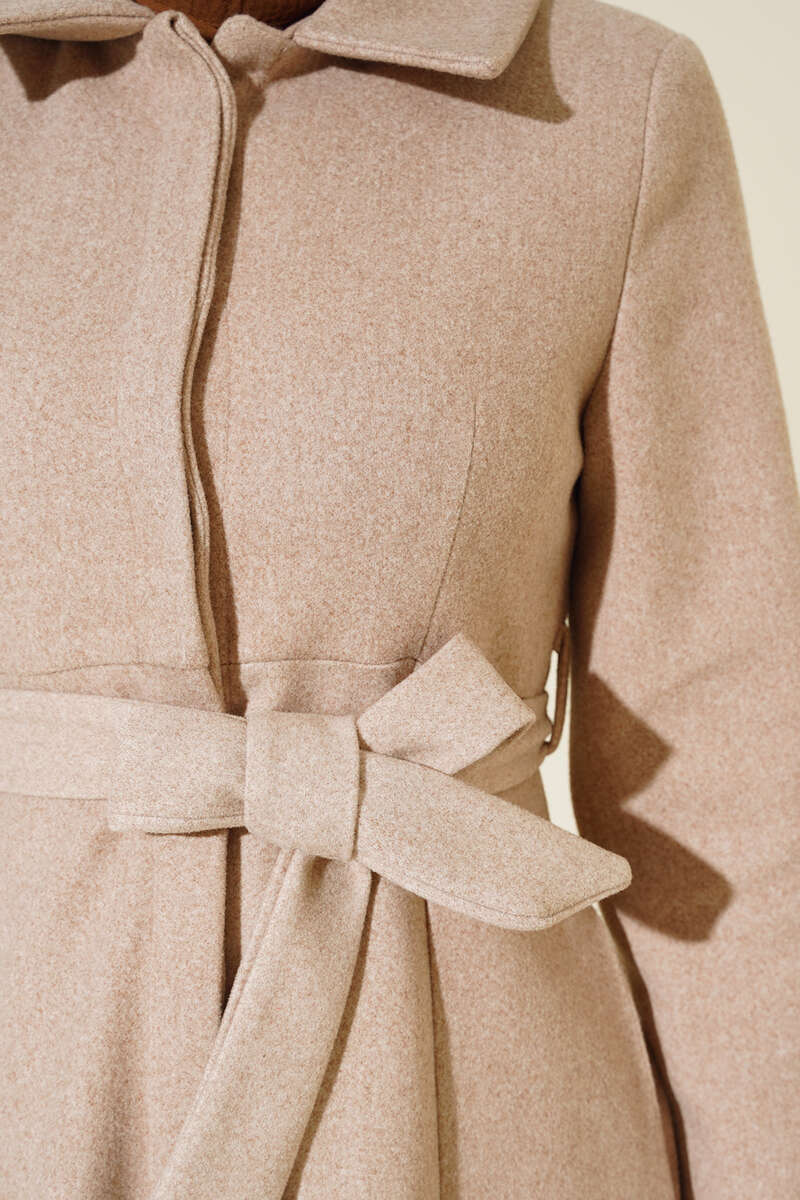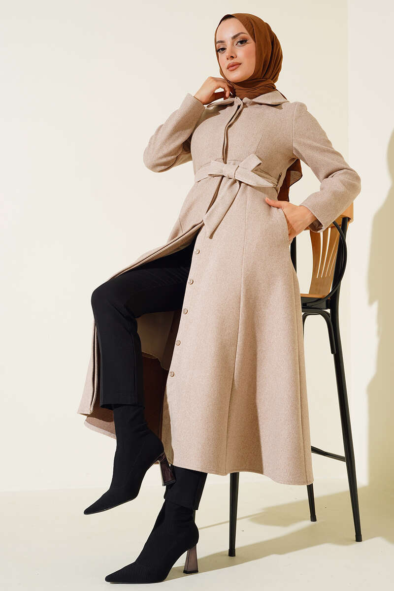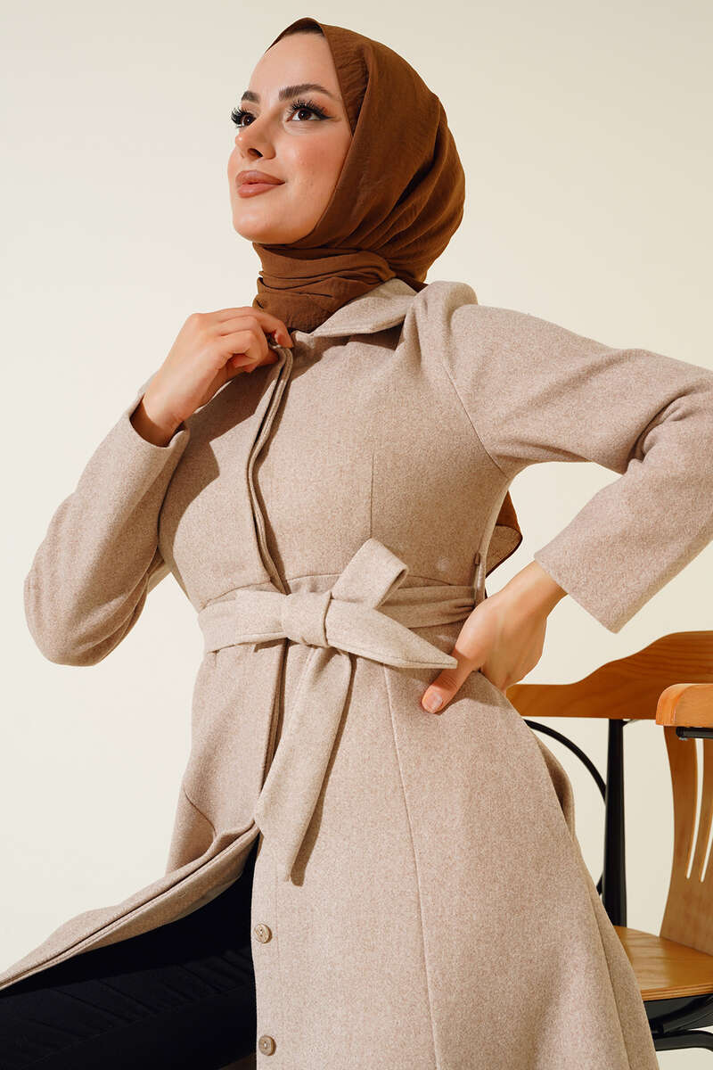 Yeni sezon çan kesim kaşe kabanımız boydan düğmelidir. Klasik yaka olan kabanımızın düğmeleri gizli patlıdır. İçi astarlıdır. Beli kuşaklı olan kabanımıızn iki adet kemer köprüsü bulunmaktadır.