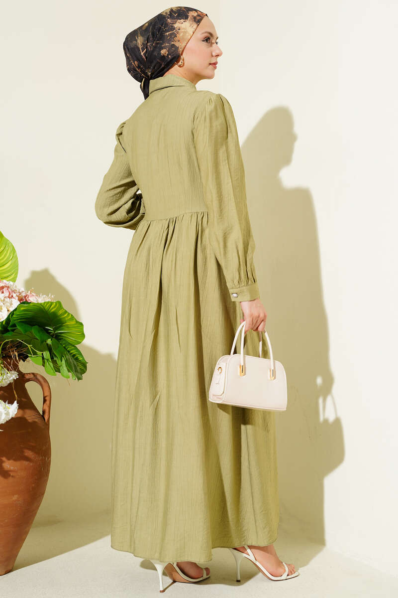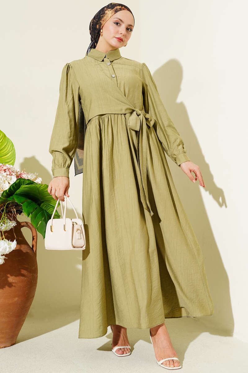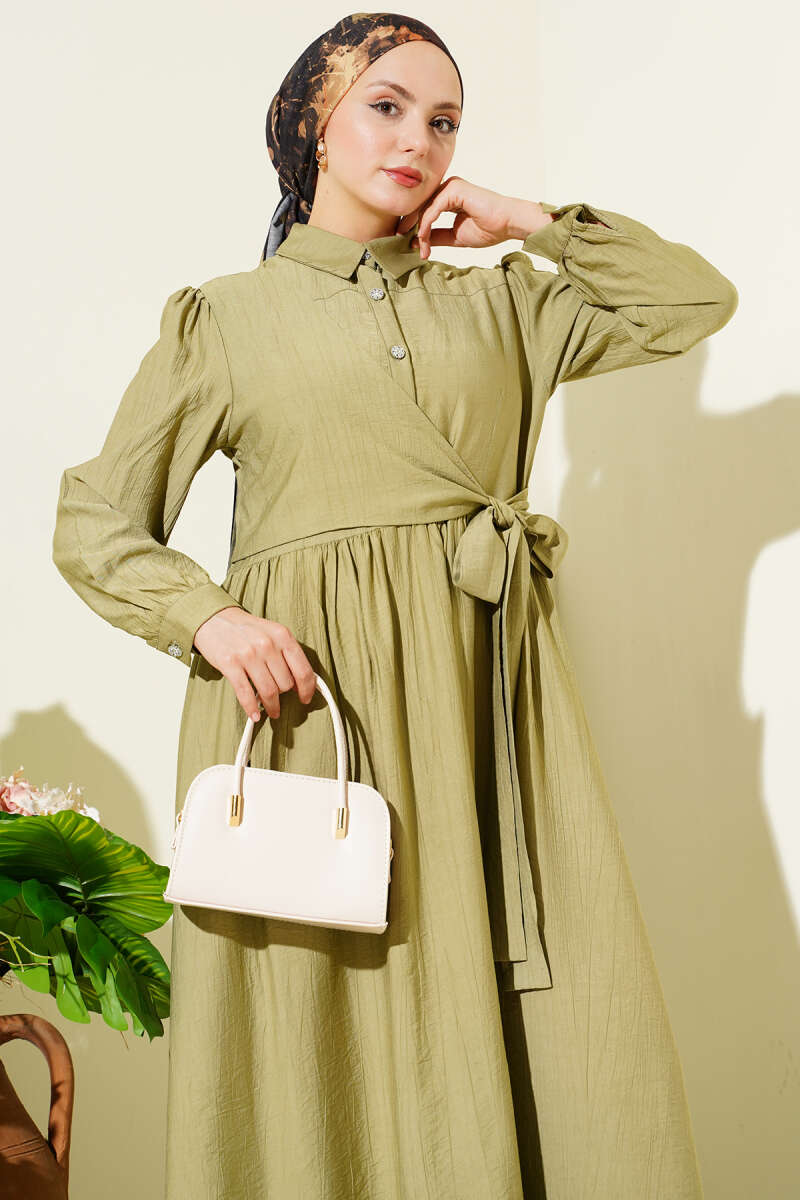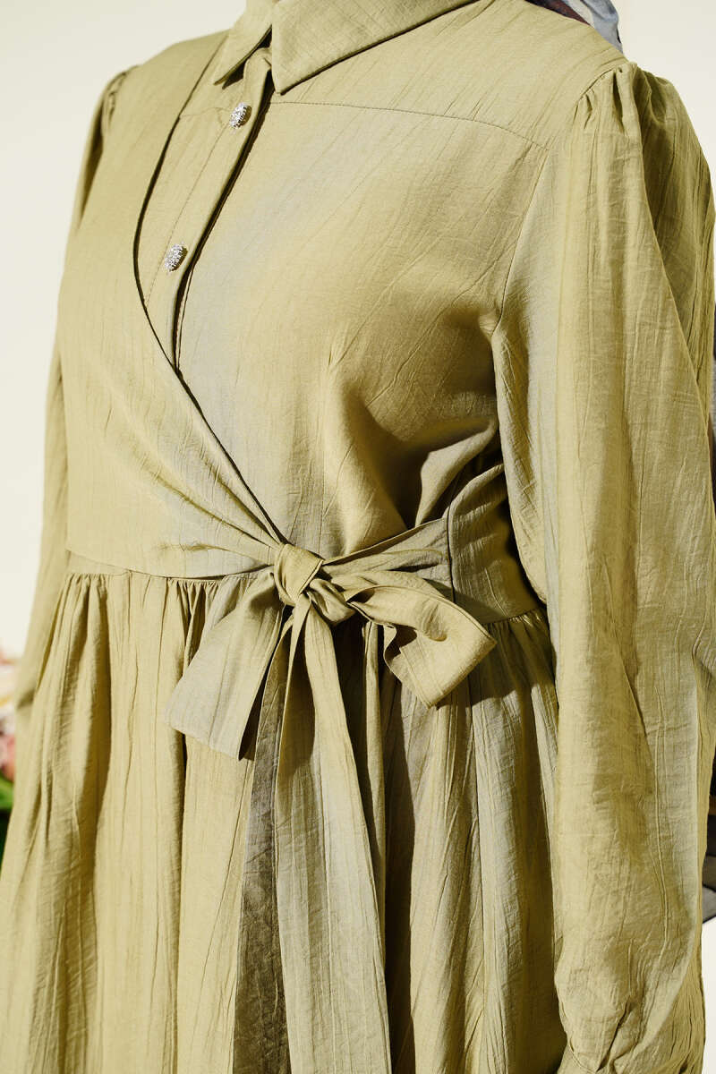 Çapraz Bağlamalı Taş Düğmeli Elbise Çağla Yeşili