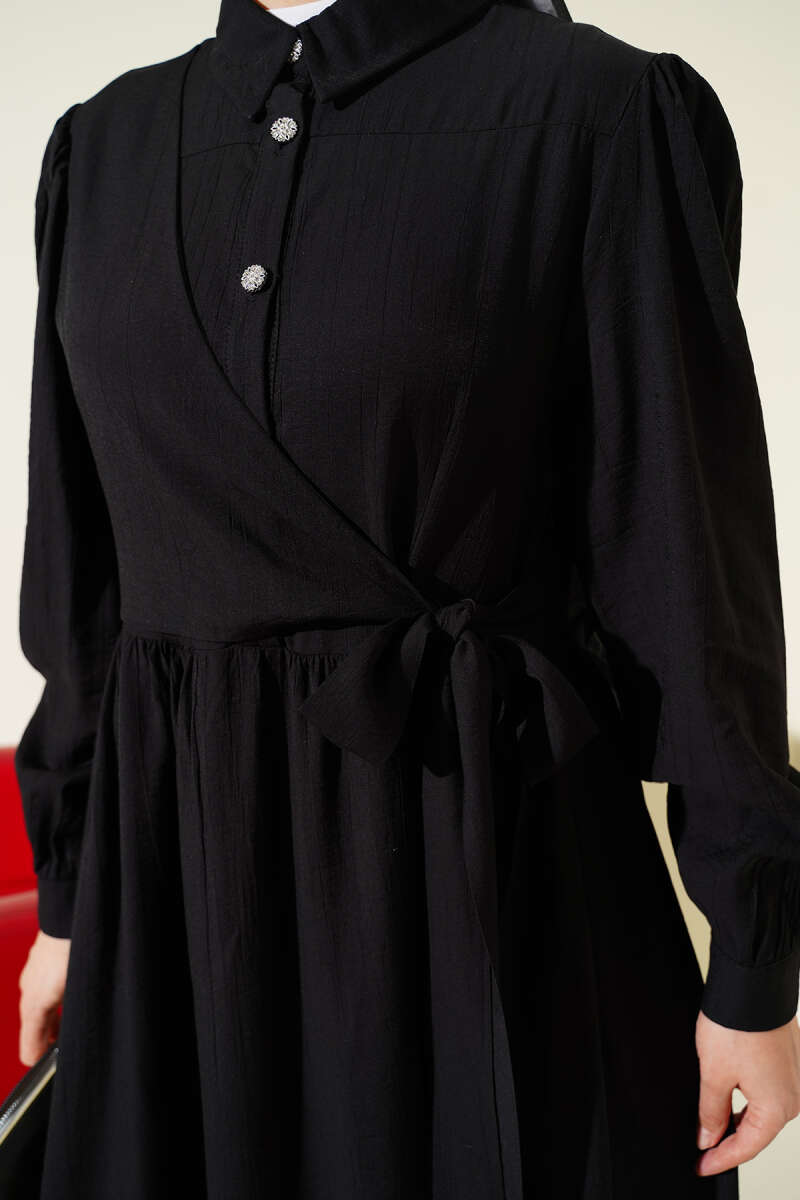 Çapraz Bağlamalı Taş Düğmeli Elbise Siyah