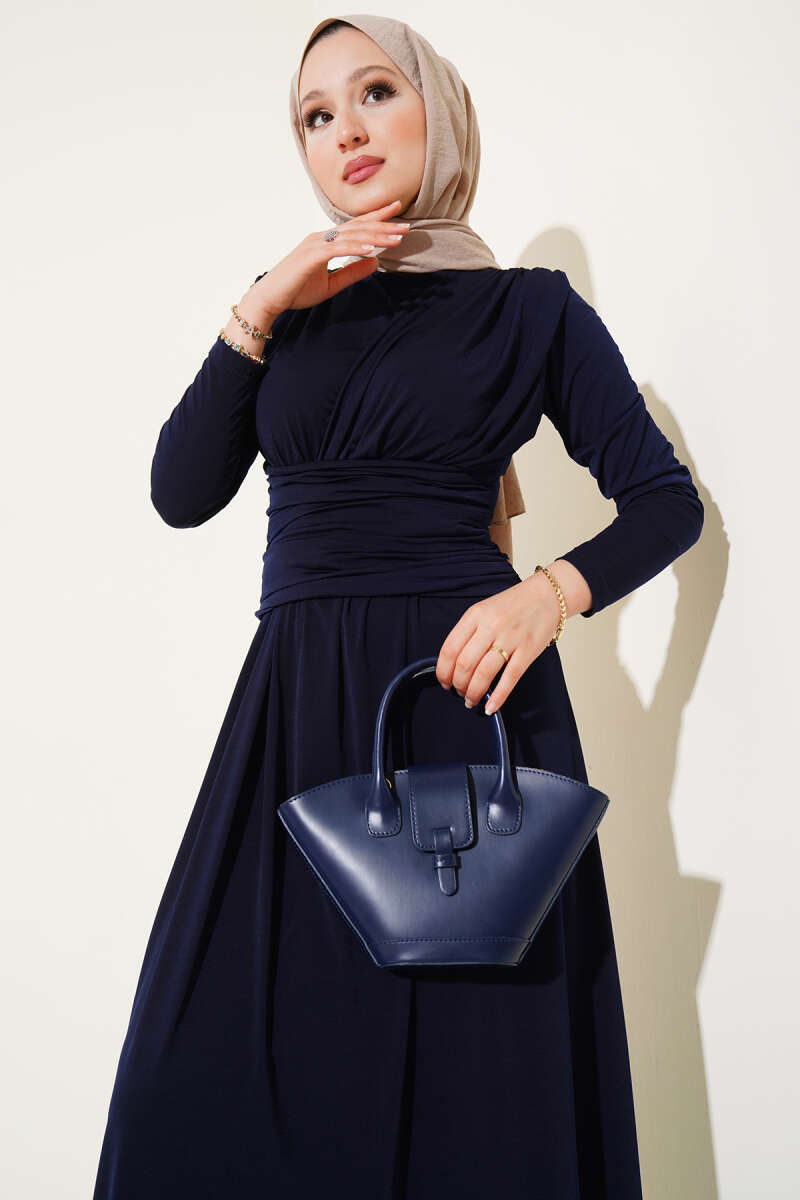 Bilek Bağlamalı Kuşaklı Abiye Elbise Lacivert