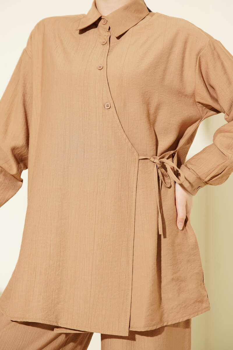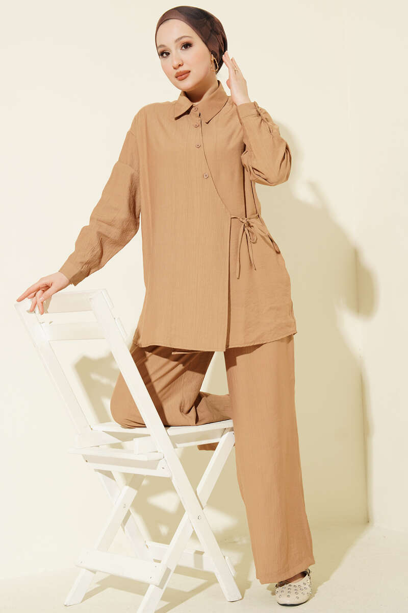 Çapraz Düğmeli Yan Bağcıklı İkili Takım Latte