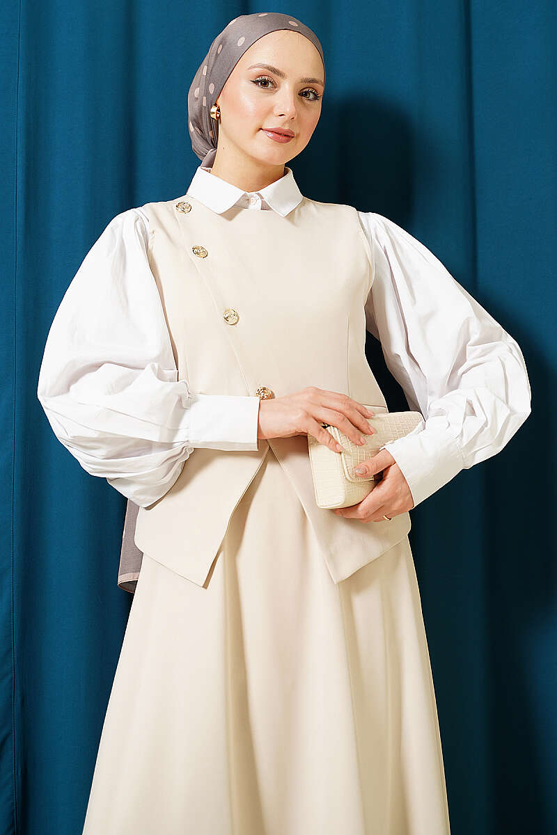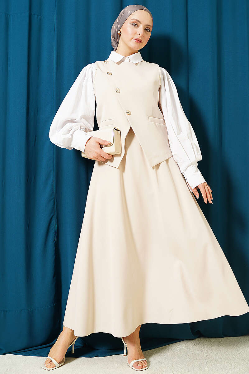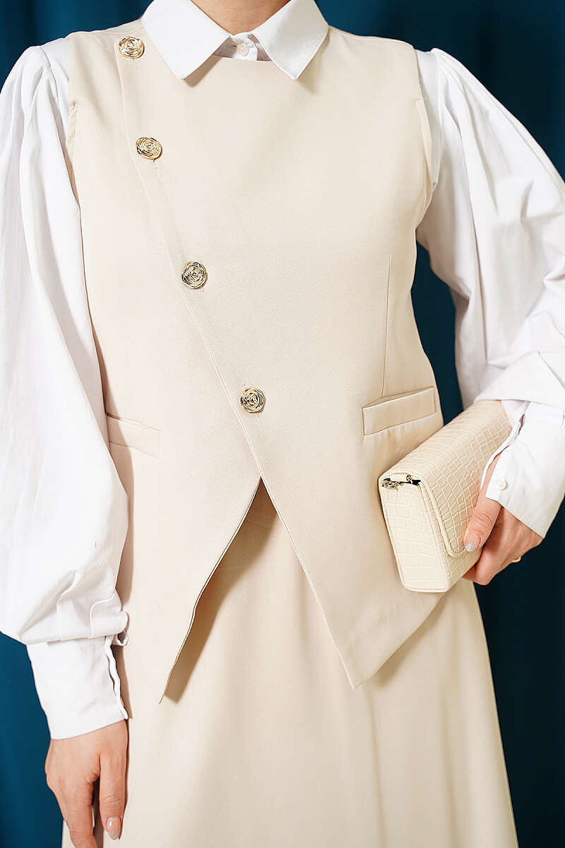Çapraz Düğmeli Yelekli Etekli Takım Bej