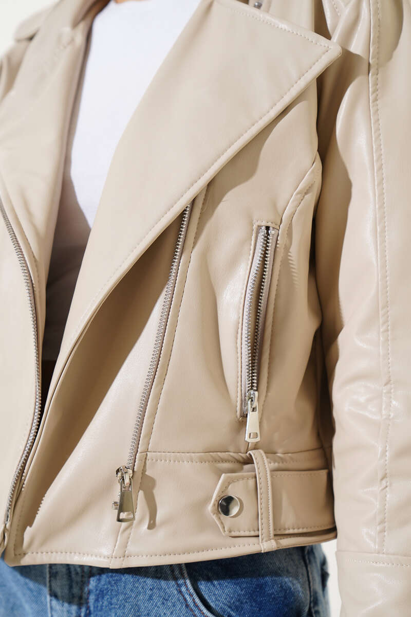 Çapraz Fermuarlı Kısa Deri Ceket Bej