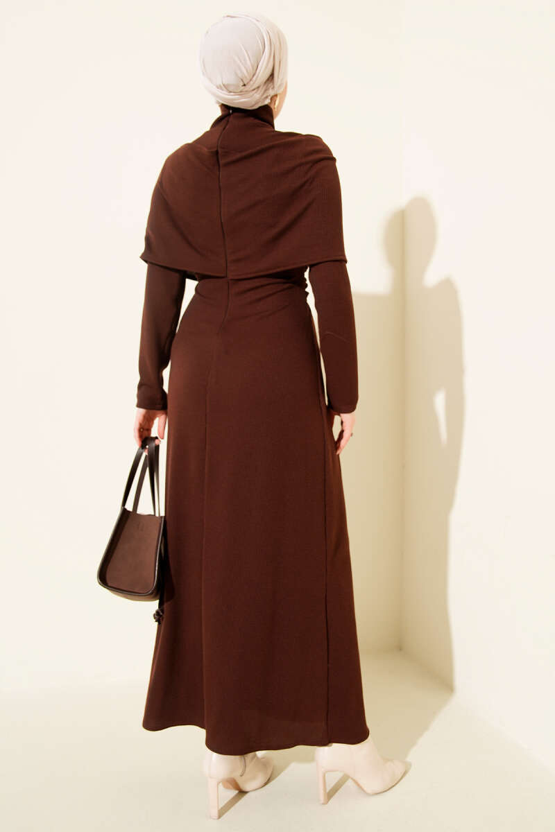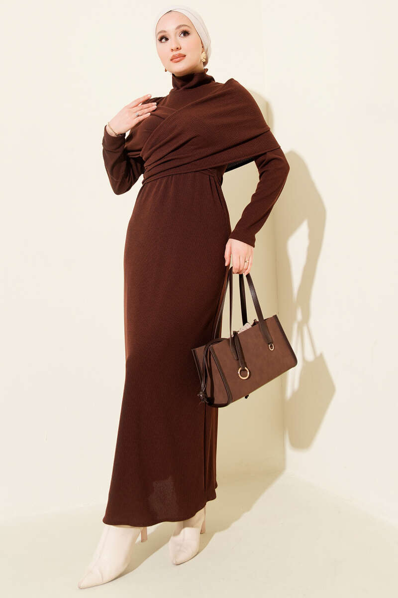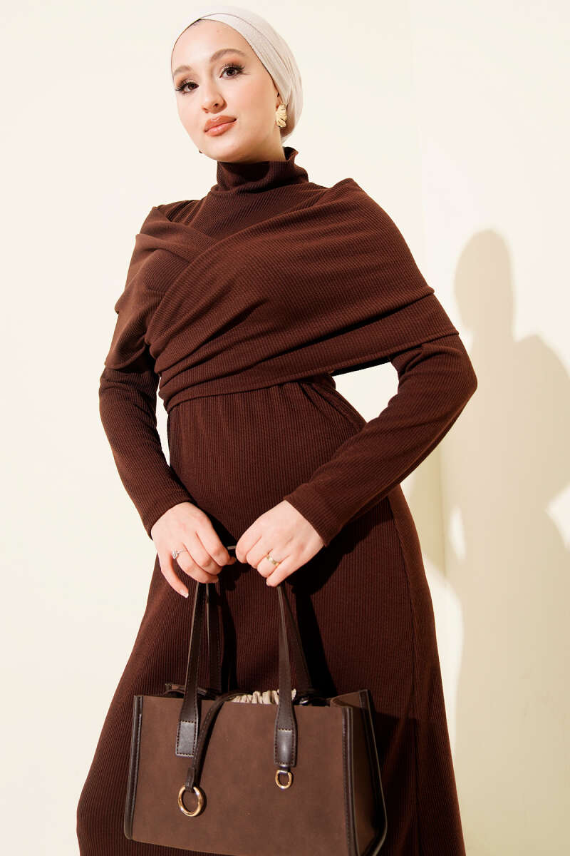 Çapraz Geçişli Fitilli Elbise Kahve
