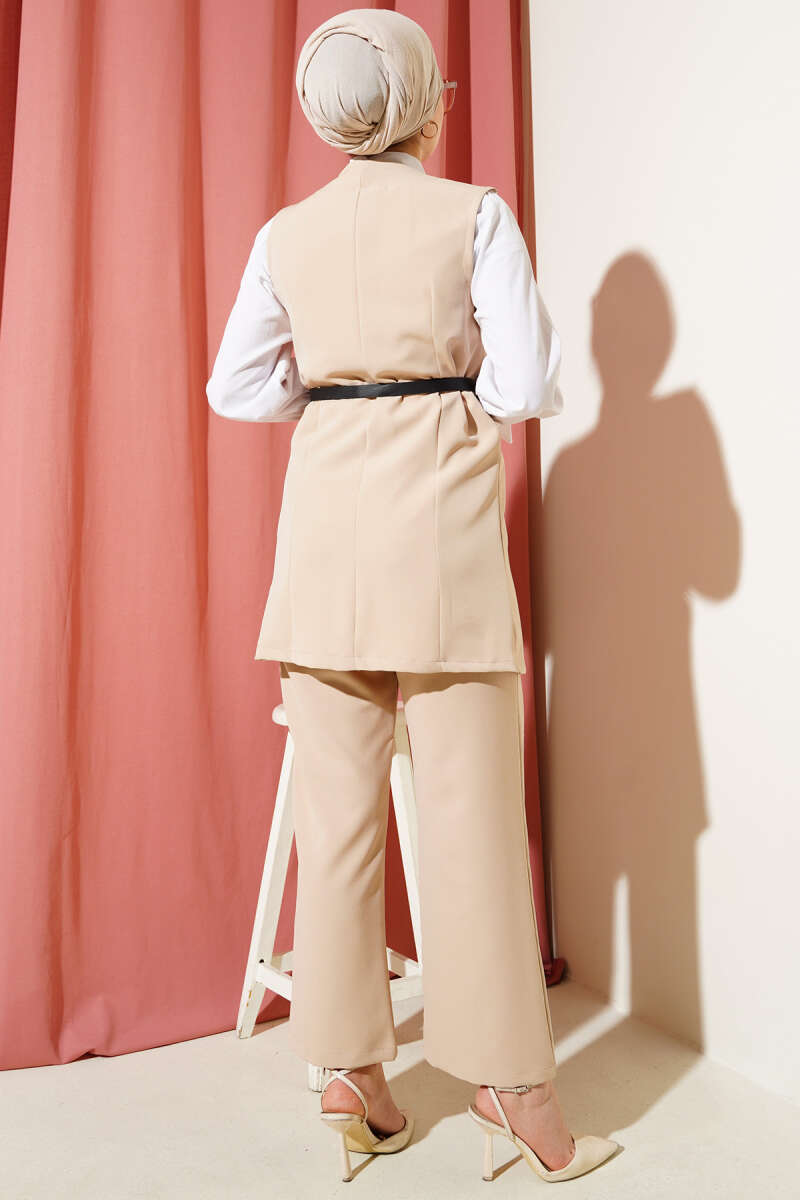 Çapraz Mini Düğmeli Yelekli Kemerli İkili Takım Bej