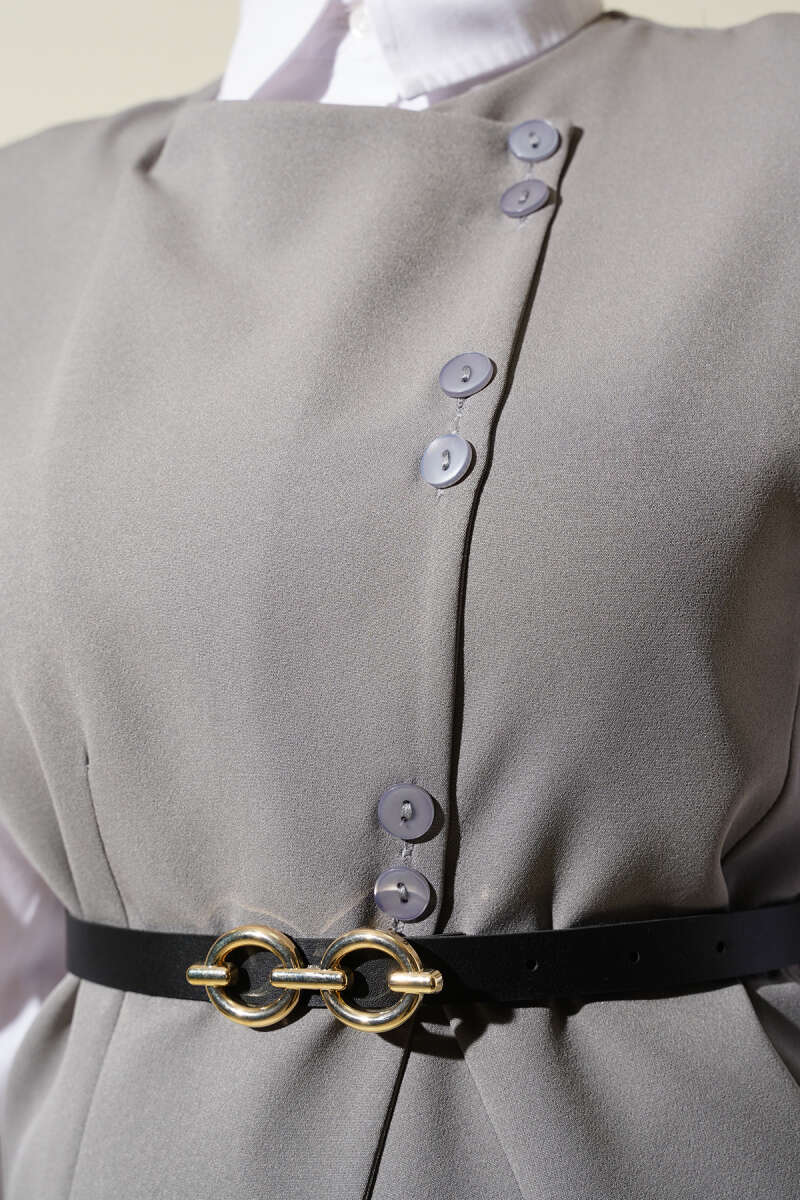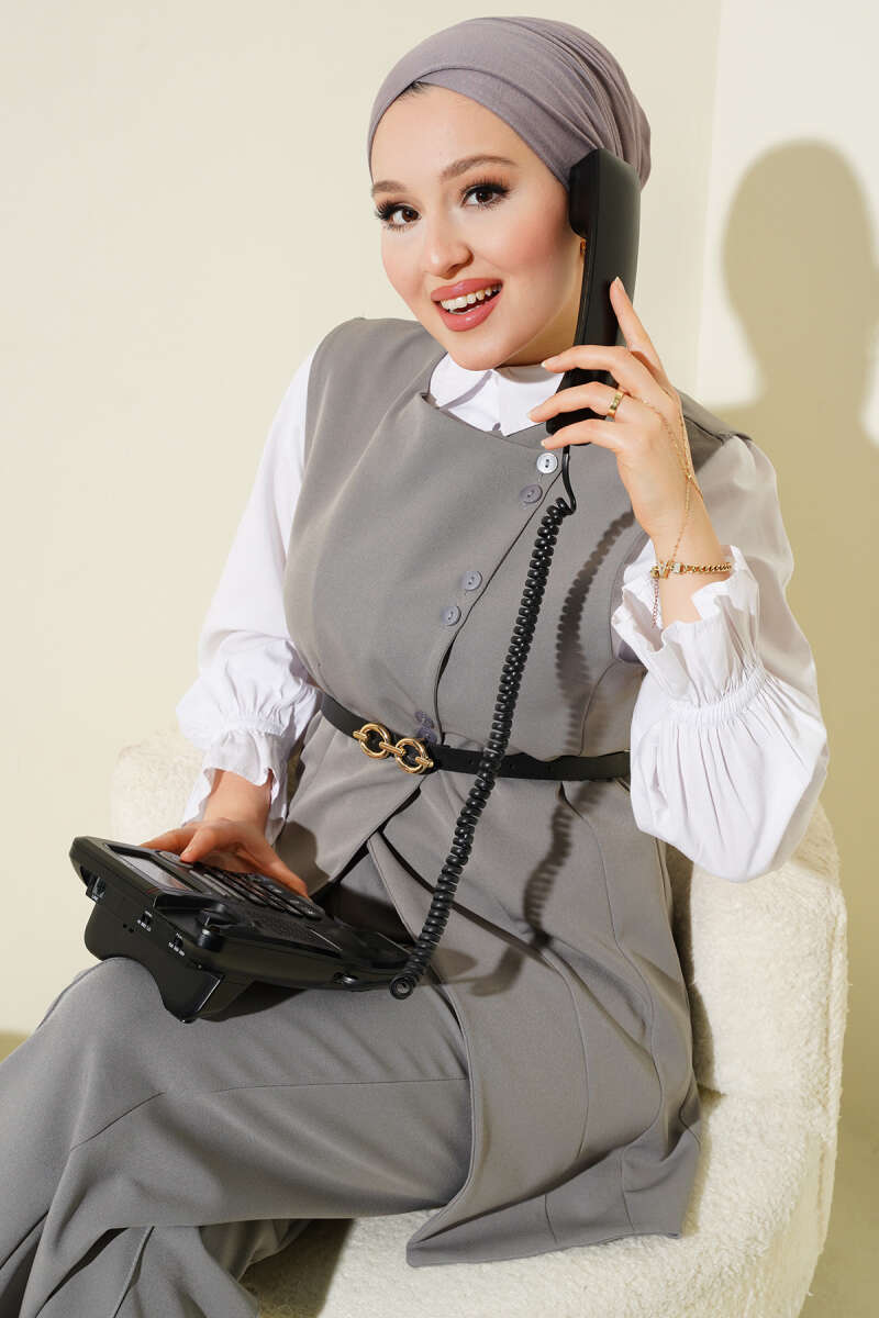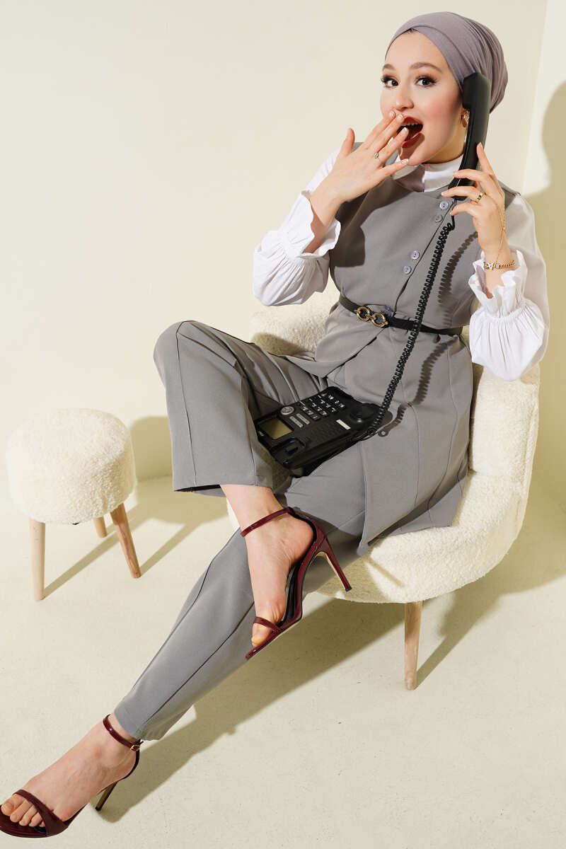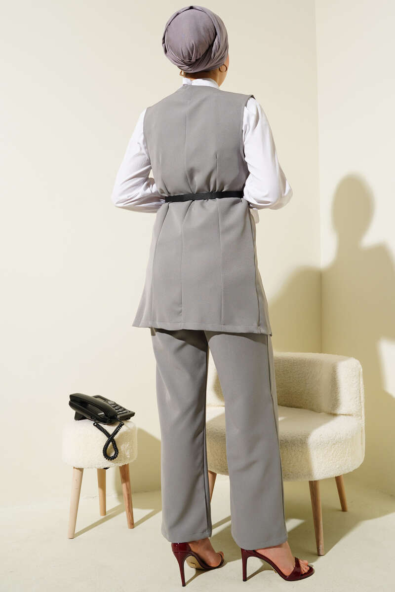 Çapraz Mini Düğmeli Yelekli Kemerli İkili Takım Gri