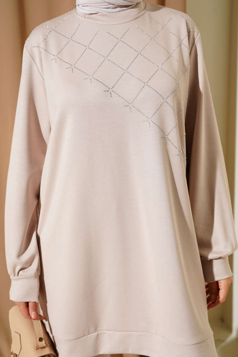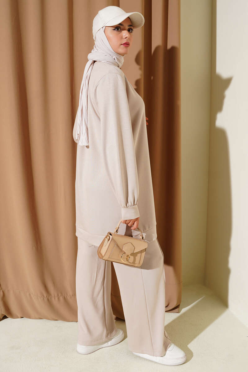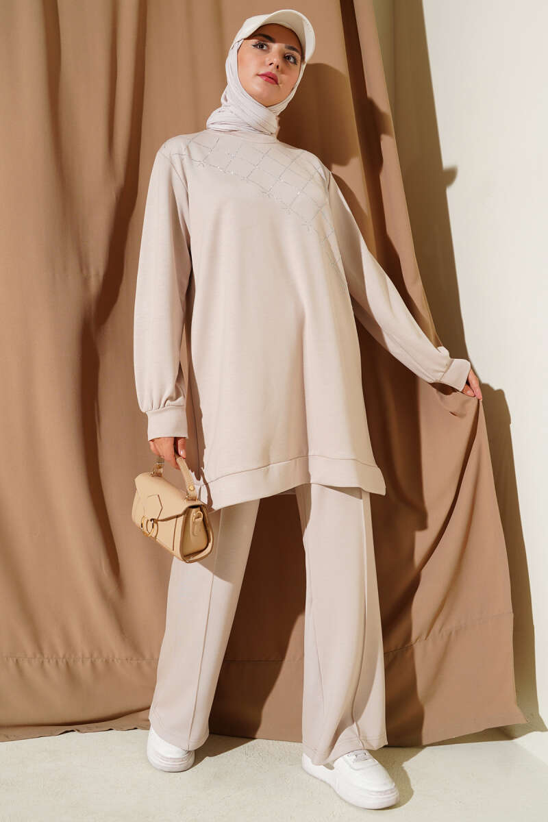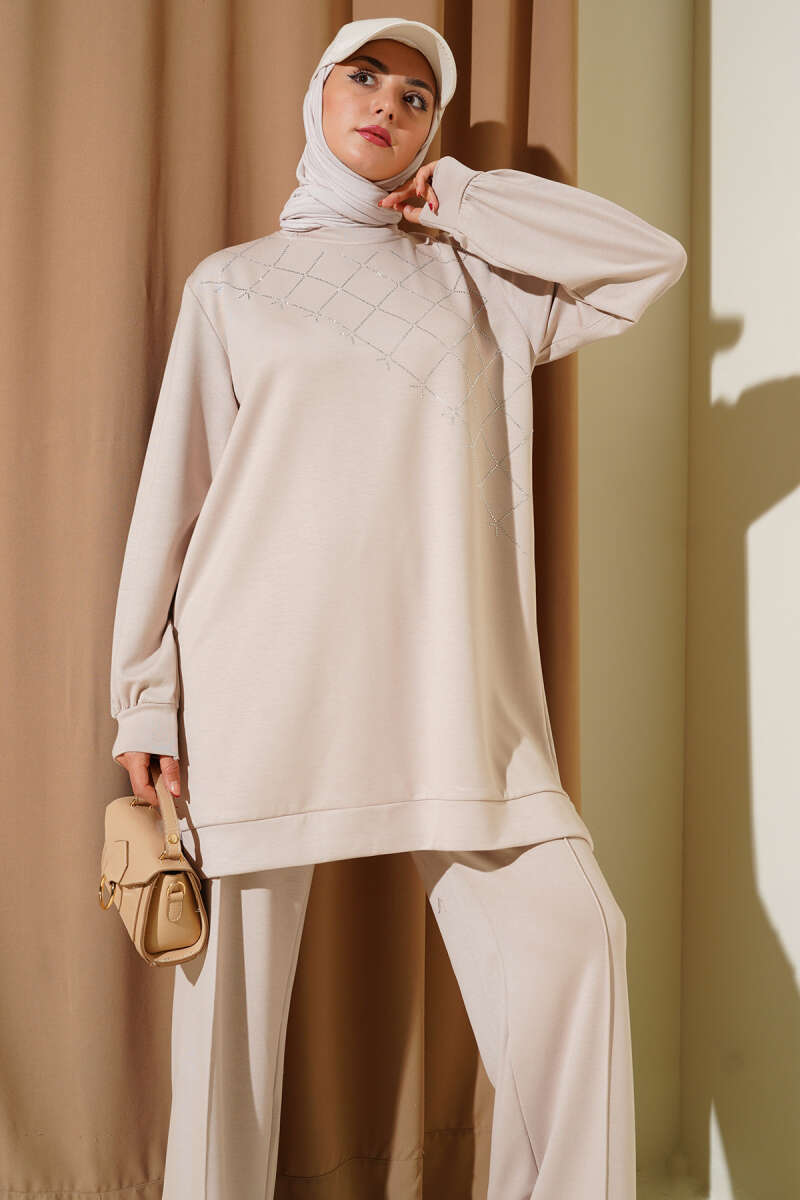 Çapraz Taş Süslemeli İkili Takım Bej