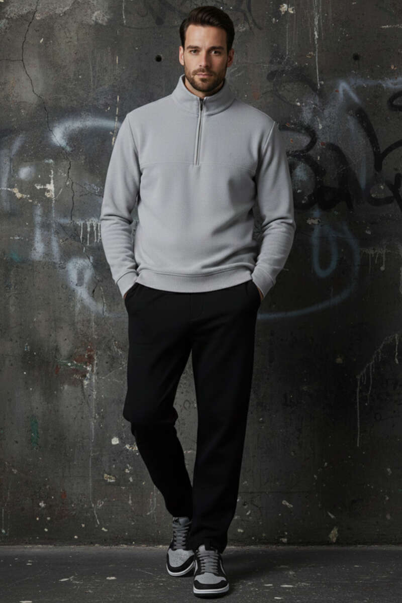 Üç İplik Yarım Fermuarlı Erkek Sweatshirt Siyah