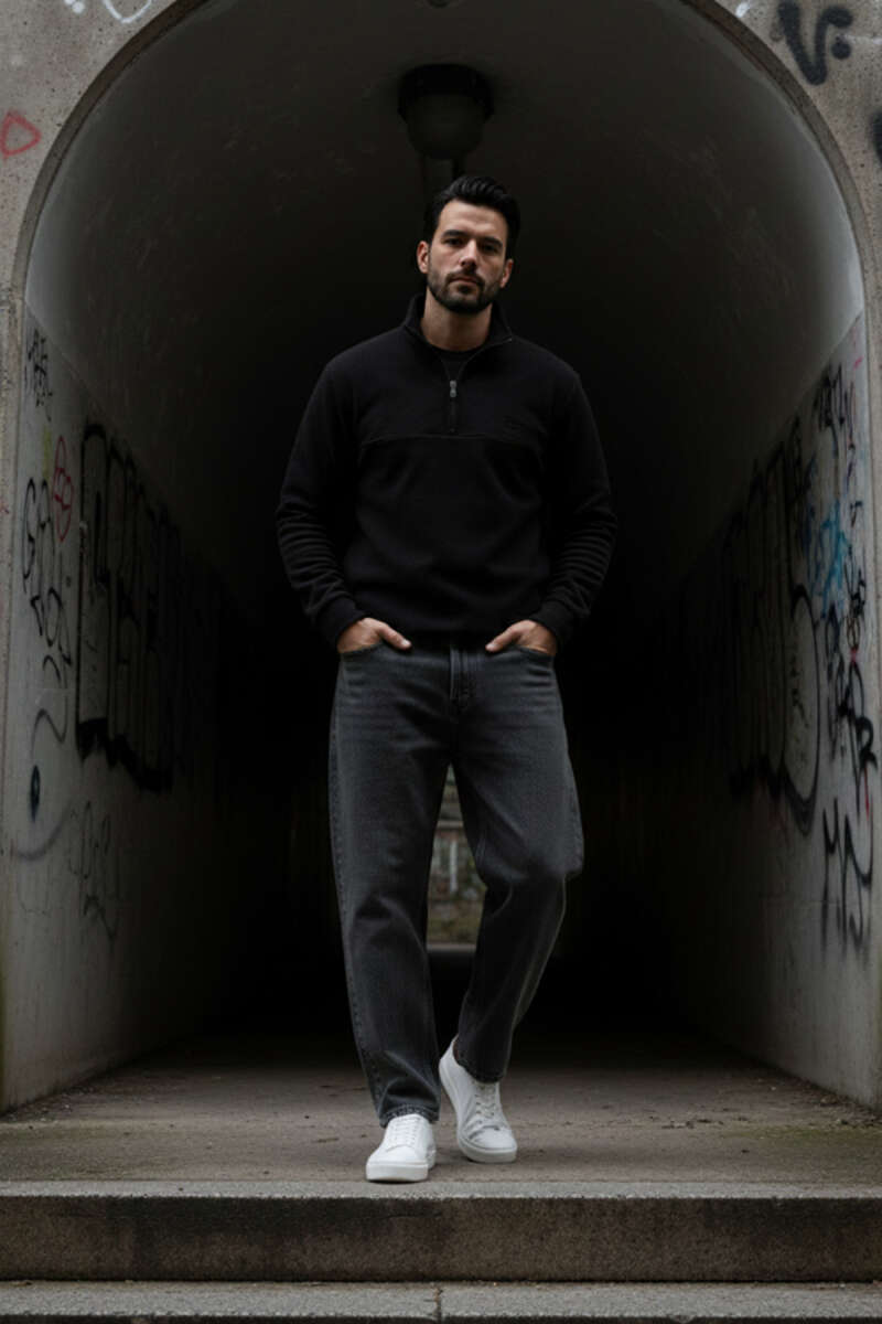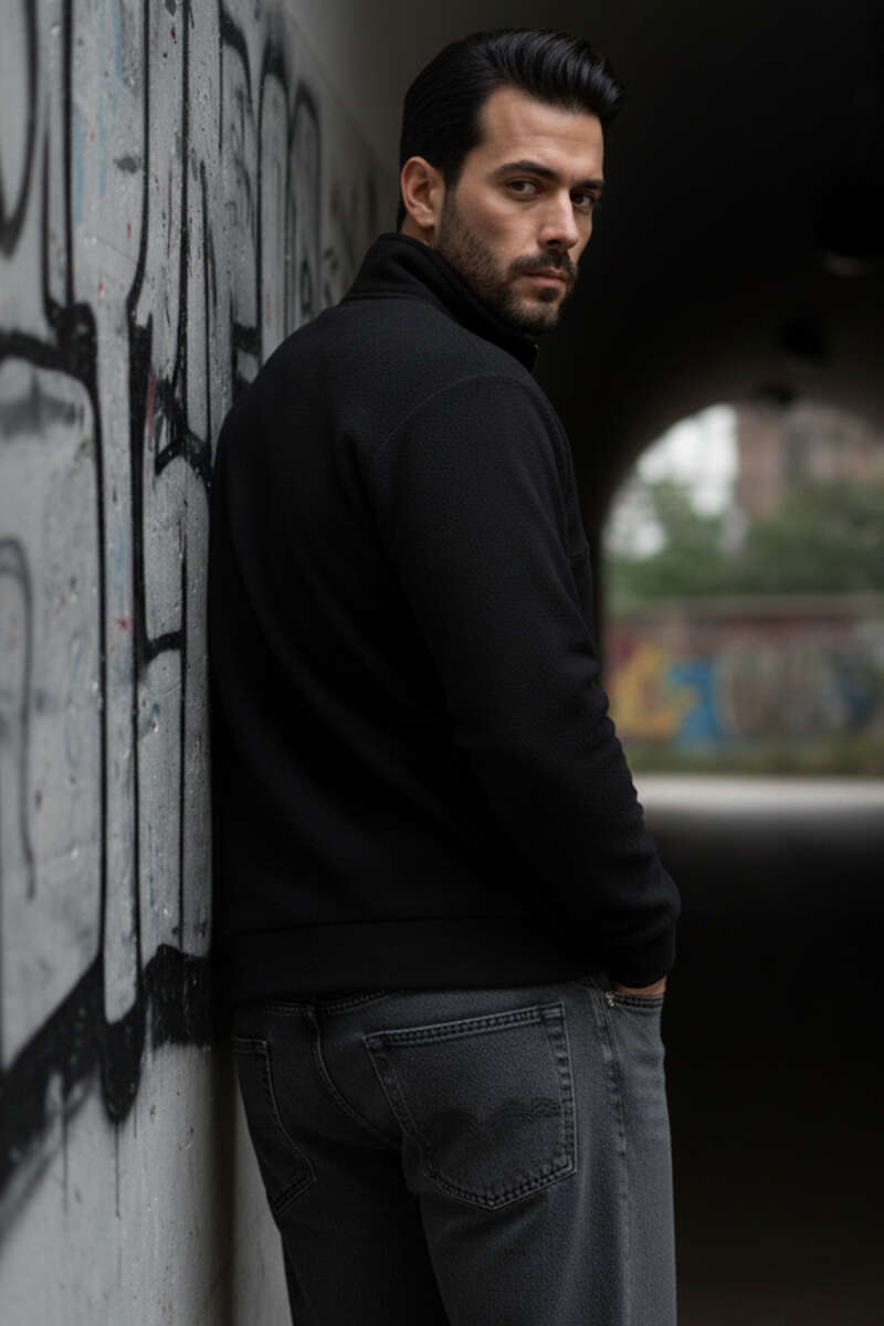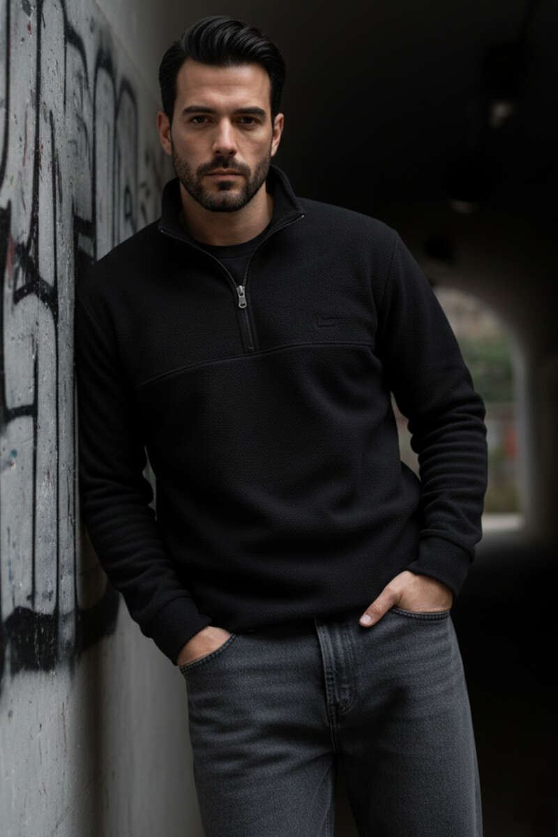 Casual Yaka Yazılı Fermuarlı Erkek Sweatshirt Siyah