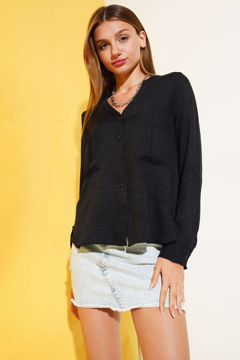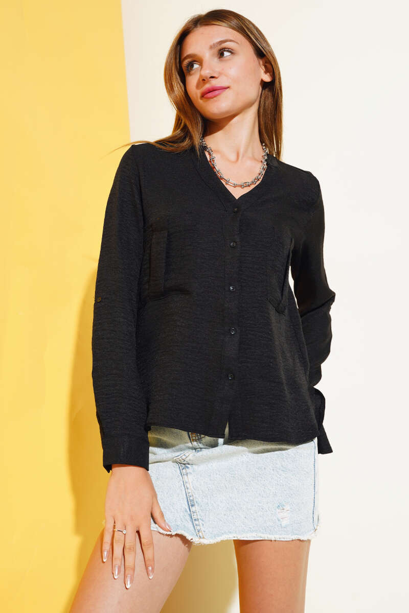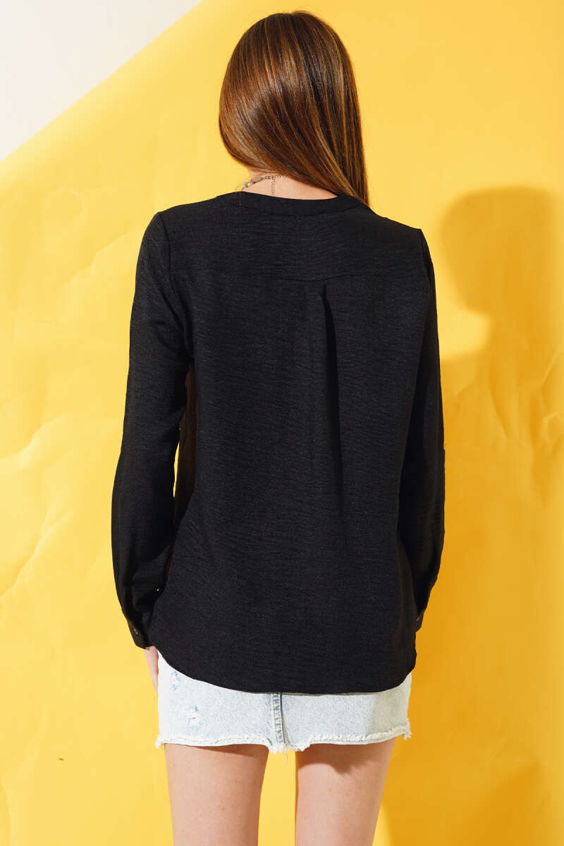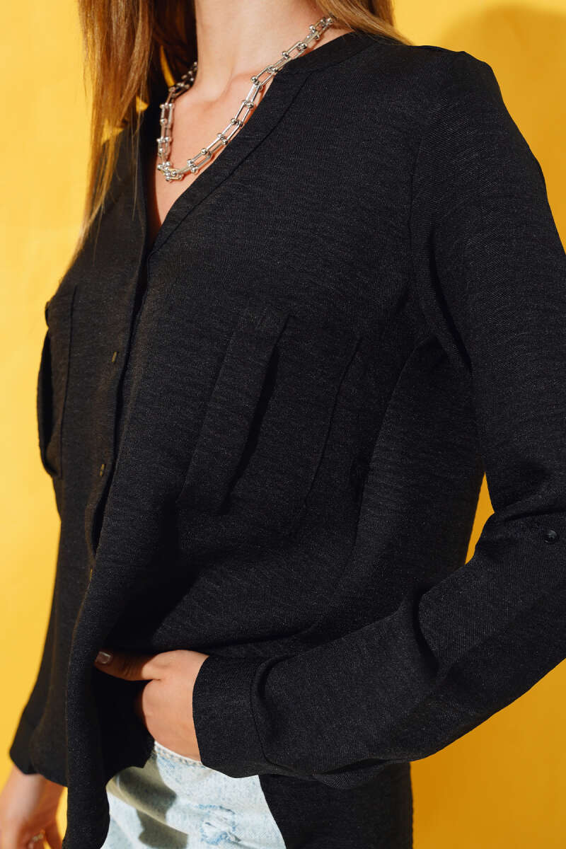 Yanları Tüllü Çift Yaka Gömlek Siyah