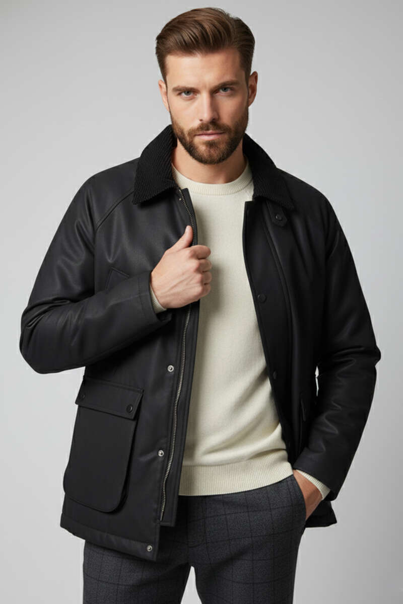 Cep Detaylı Erkek Deri Mont Siyah