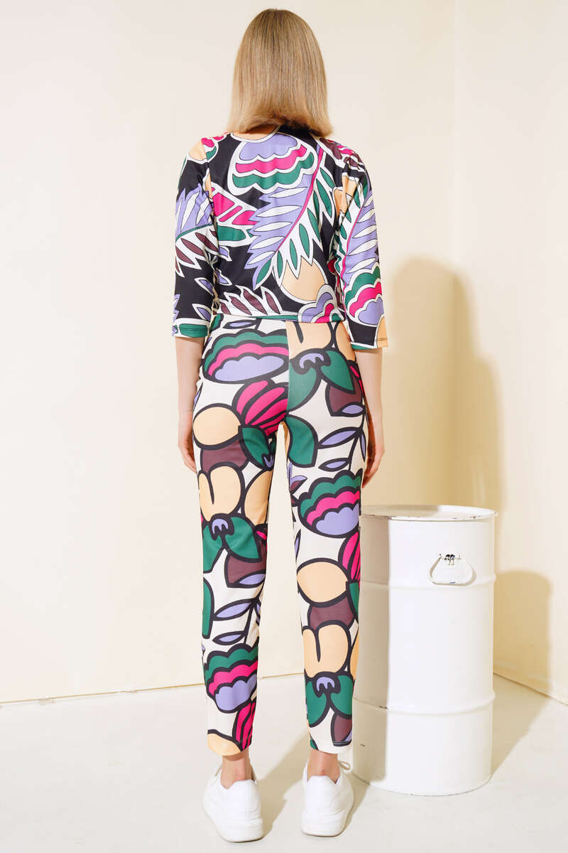 Yeni sezon ikili takım modelimiz sizlerle beraber. Takımımıza renkli desenleri hareketlilik kazandırmıştır. Ceketimizin boyu kısa olup fakir koldur. Pantolonumuzun beli lastikli olup aynı zamanda fermuarlı ve düğmelidir. Paçası dar paçadır. Cepsizdir.  Takımımızı yaz günlerinizde havalı ve renkli duruşuyla çok beğeneceksiniz.