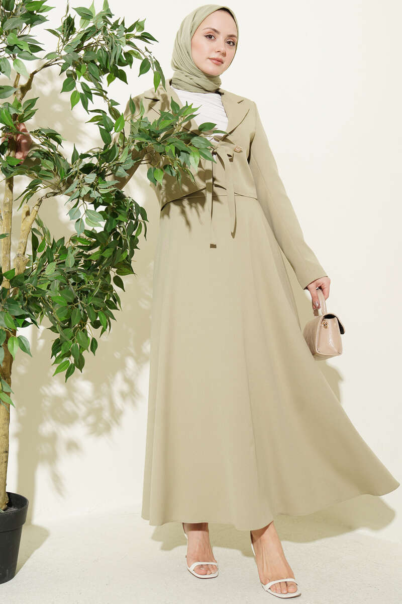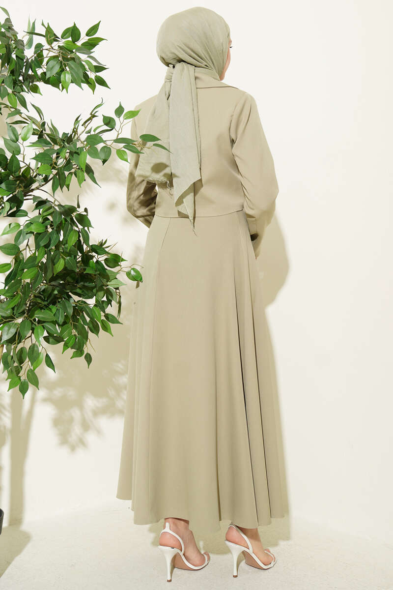 Ekoseli Yaka Bağlamalı Etekli Takım Bej