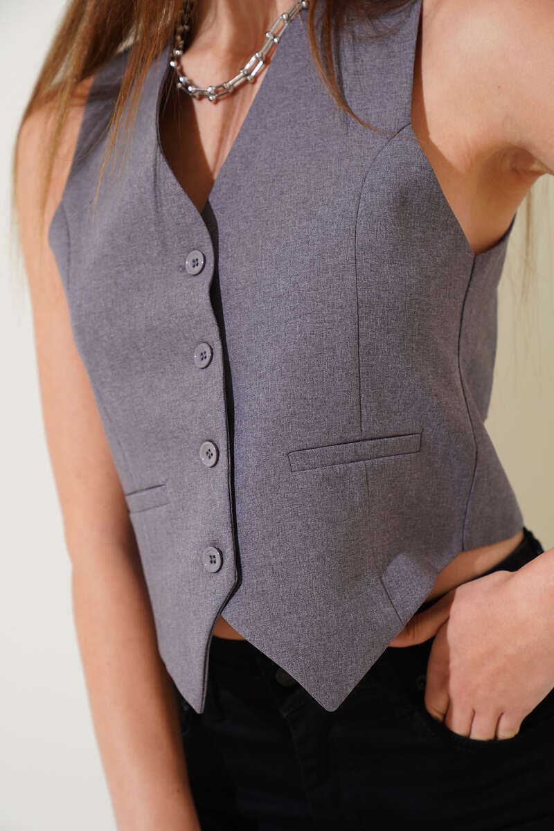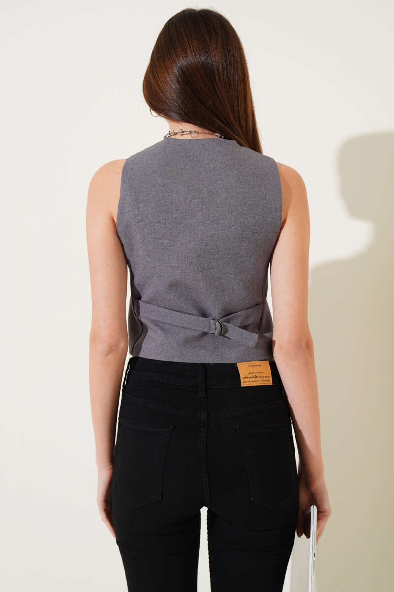 Düğmeli Şerit Detaylı Triko İkili Takım Füme
