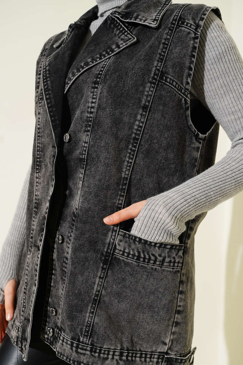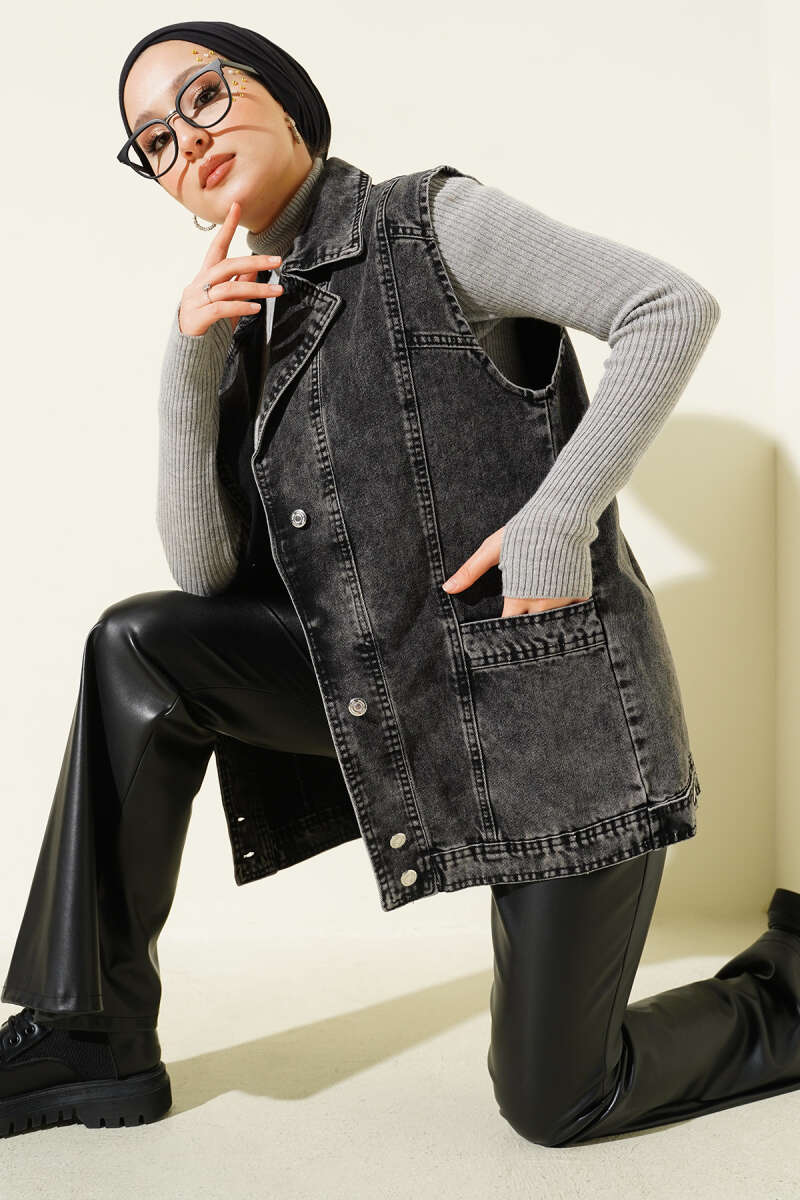 Fermuarlı Yaka Kürklü Kısa Yelek Siyah