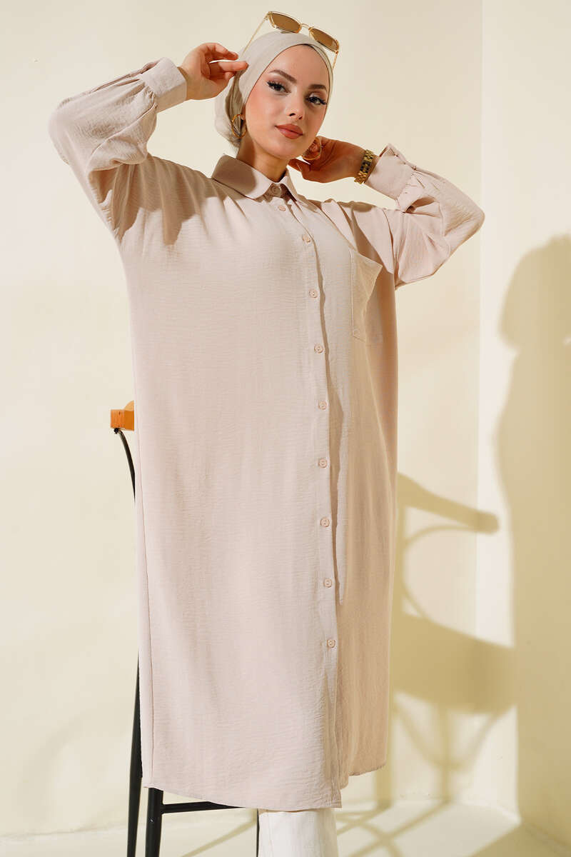 Ürün BilgisiBoy: 106 cmGöğüs: 140 cmBel: 122 cmYeni sezon tunik modelimiz sizlerle beraber. Tuniğimiz Oversize bir modeldir. Önünde bir adet cebi bulunur. Boydan düğmelidir. Kol bileklerin de iki adet düğme bulunur. Şık duruşunu ve rahat yapısını çok beğeneceksiniz. Renk seçeneklerimiz mevcuttur.Kumaş Bilgisi%70 Cotton%30 PolyesterModel BilgisiBoy : 165 cmGöğüs : 86 cmBel : 67 cmKalça : 85 cmModelin üzerindeki ürün -S-M- bedendir.