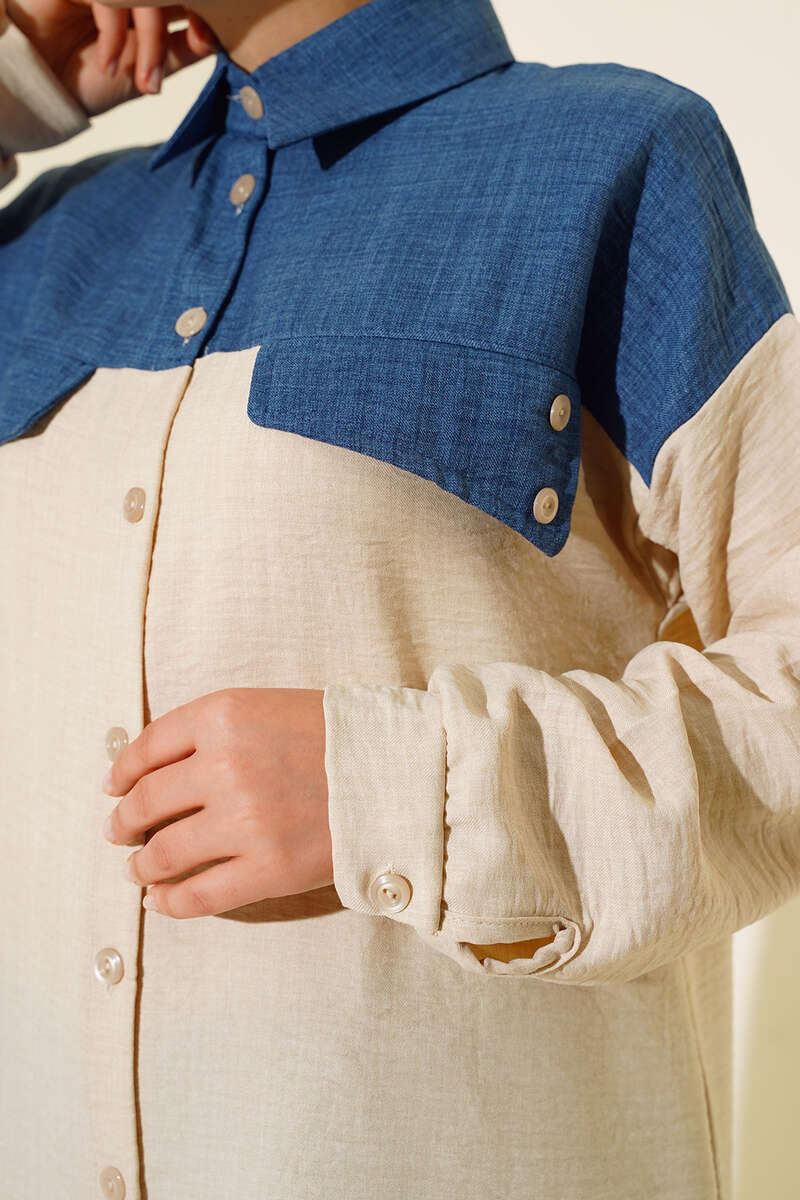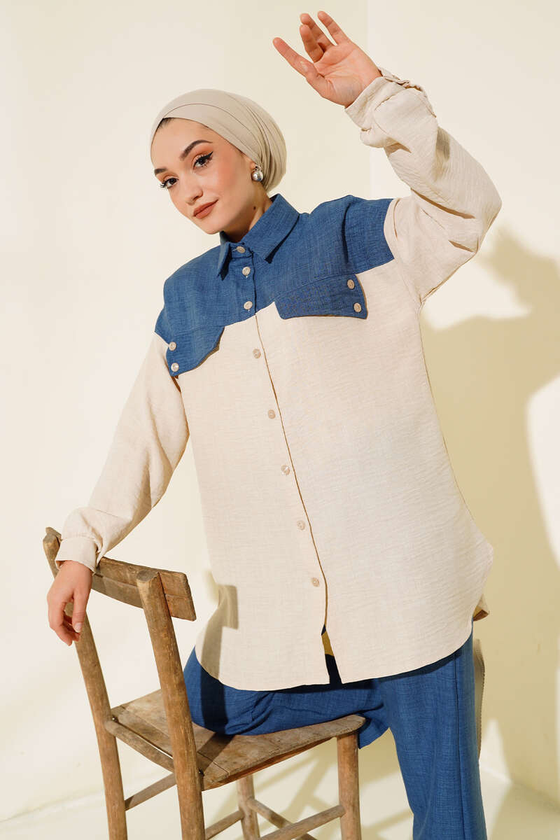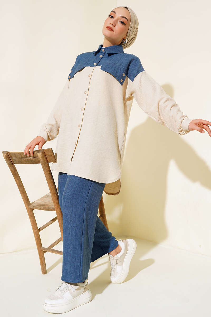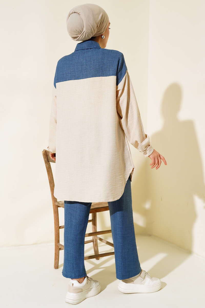 Cep Kapak Detaylı Keten İkili Takım İndigo