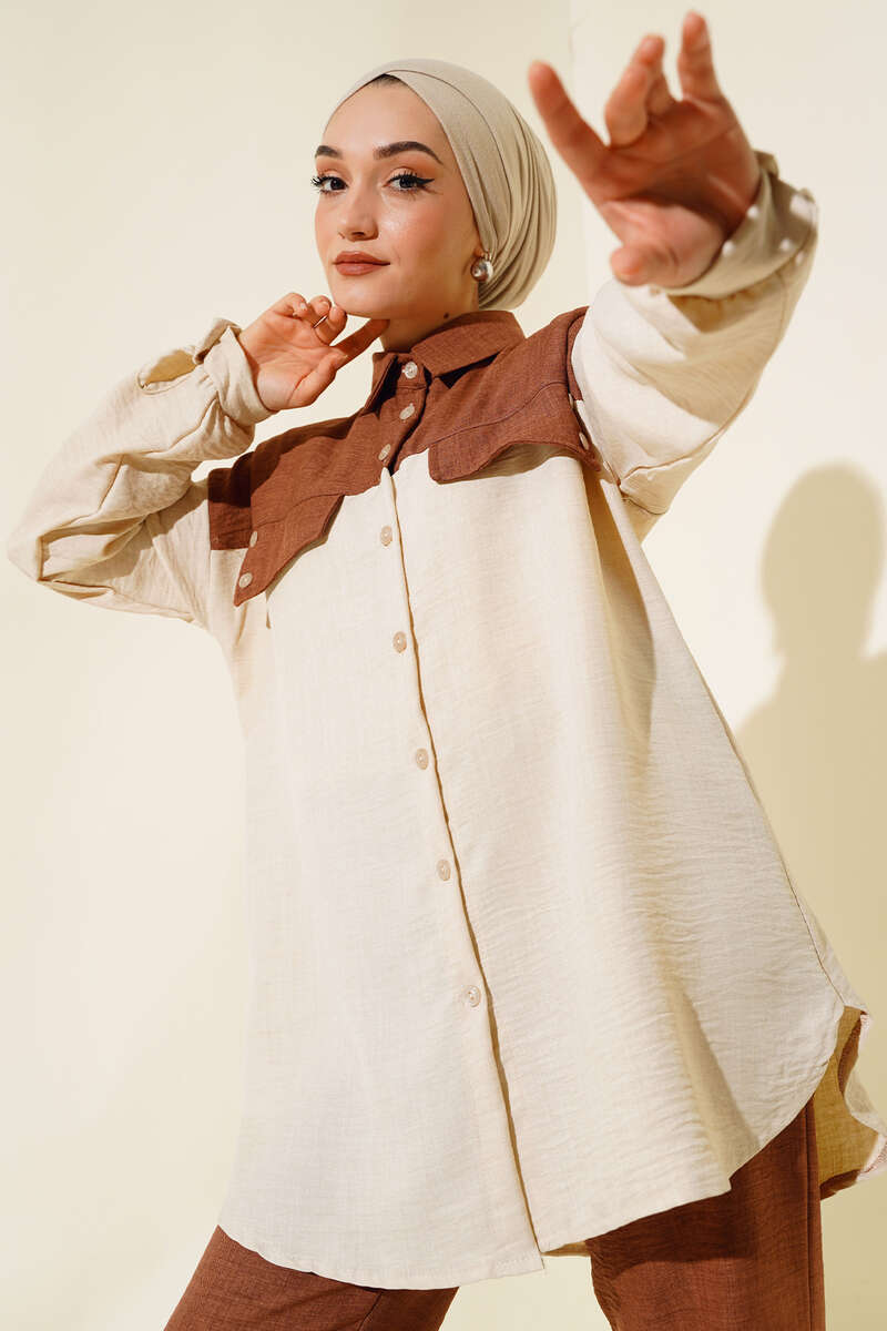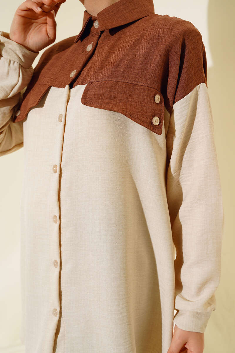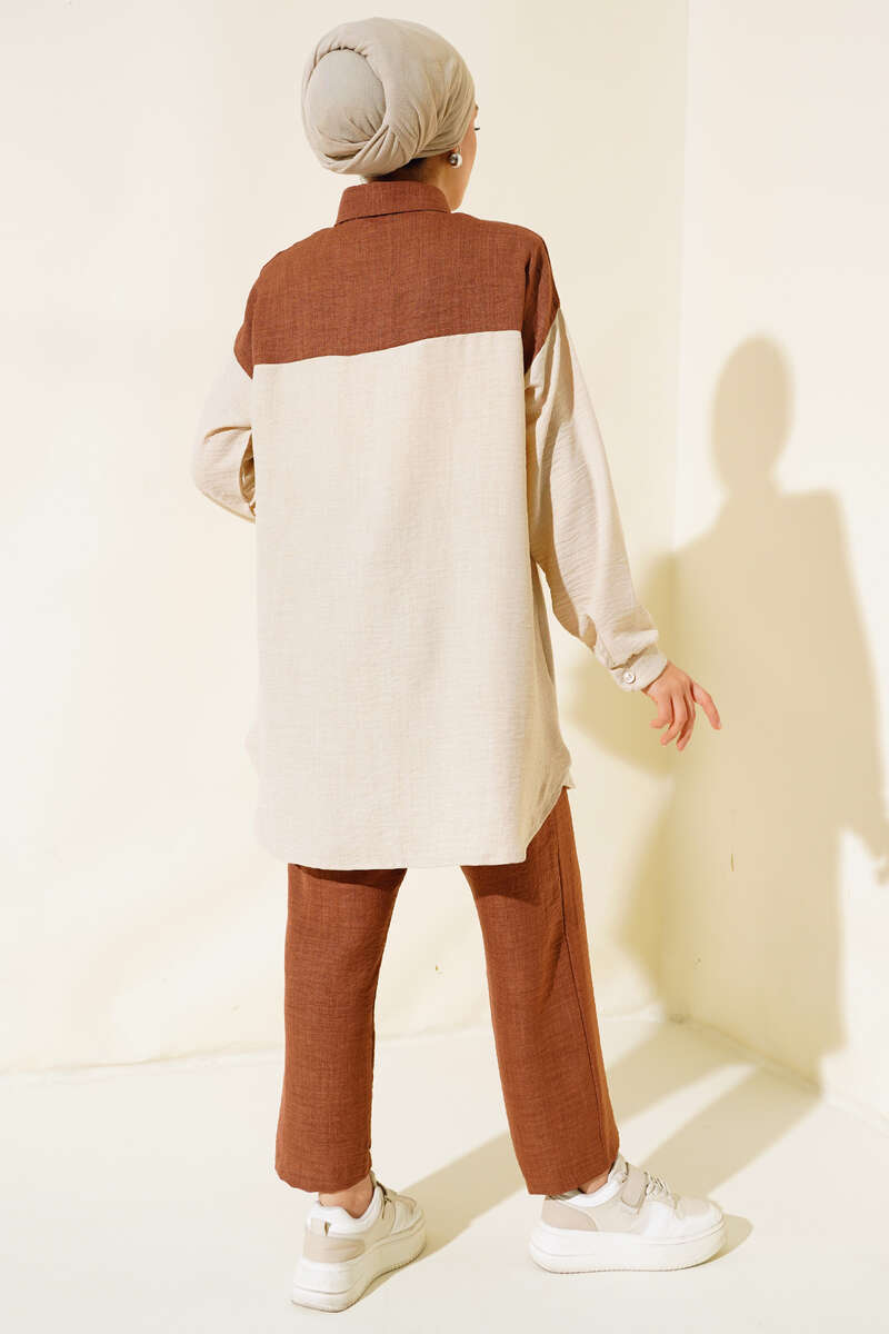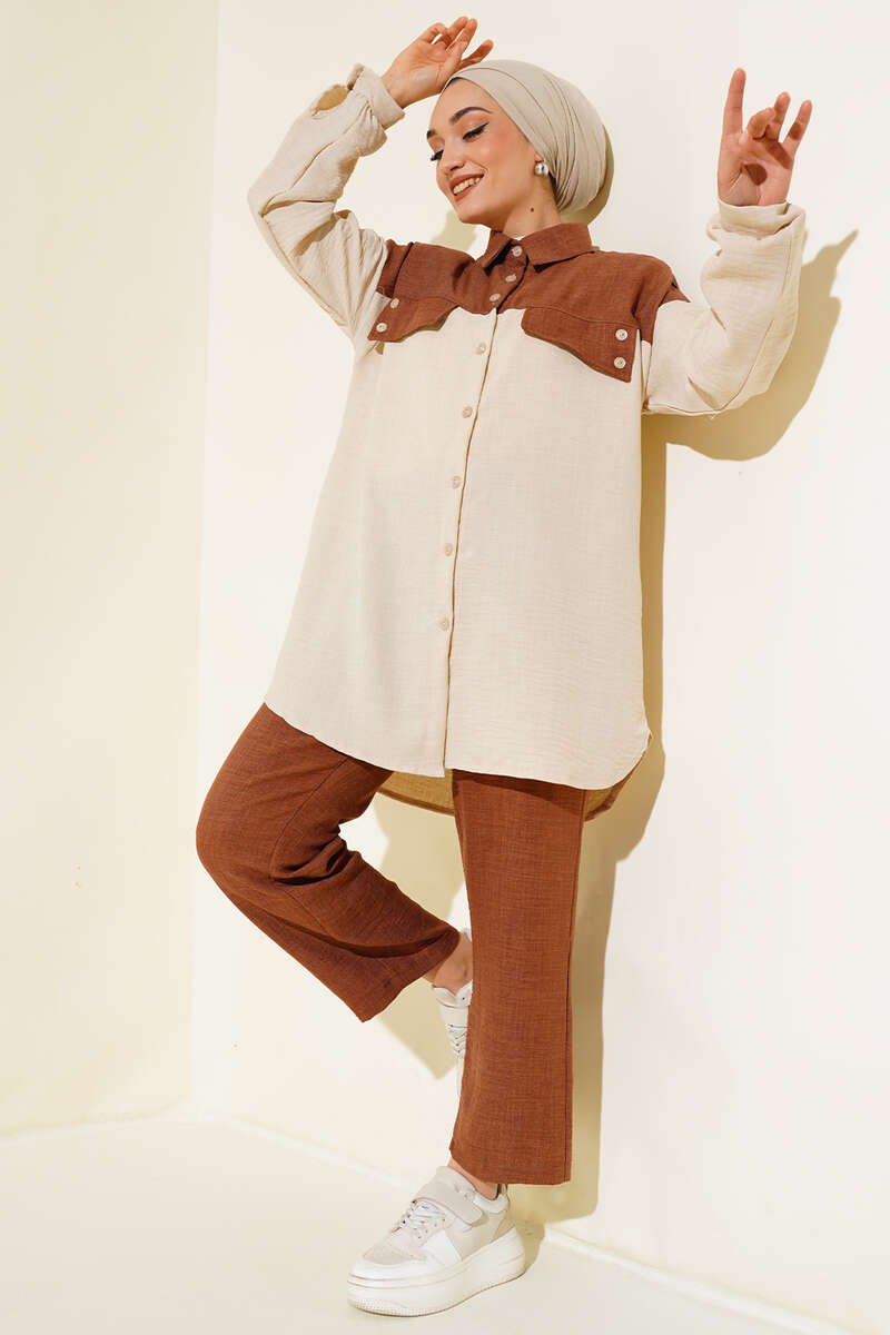 Cep Kapak Detaylı Keten İkili Takım Kahve