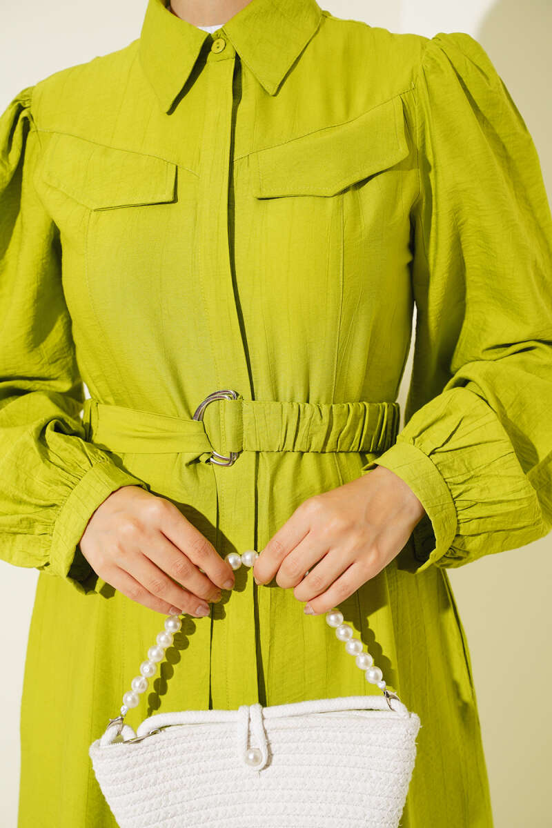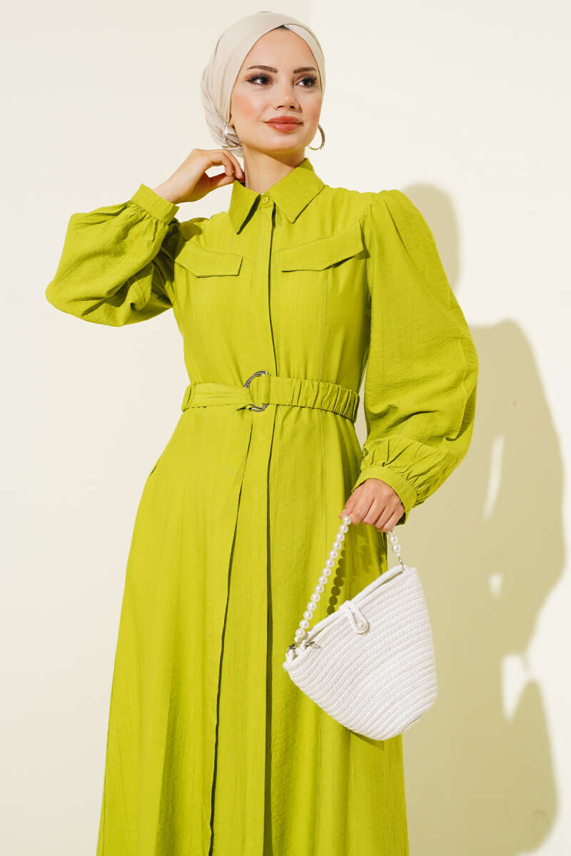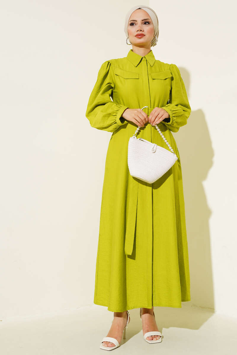 Bel Lastikli Fermuarlı Tensel Elbise Haki