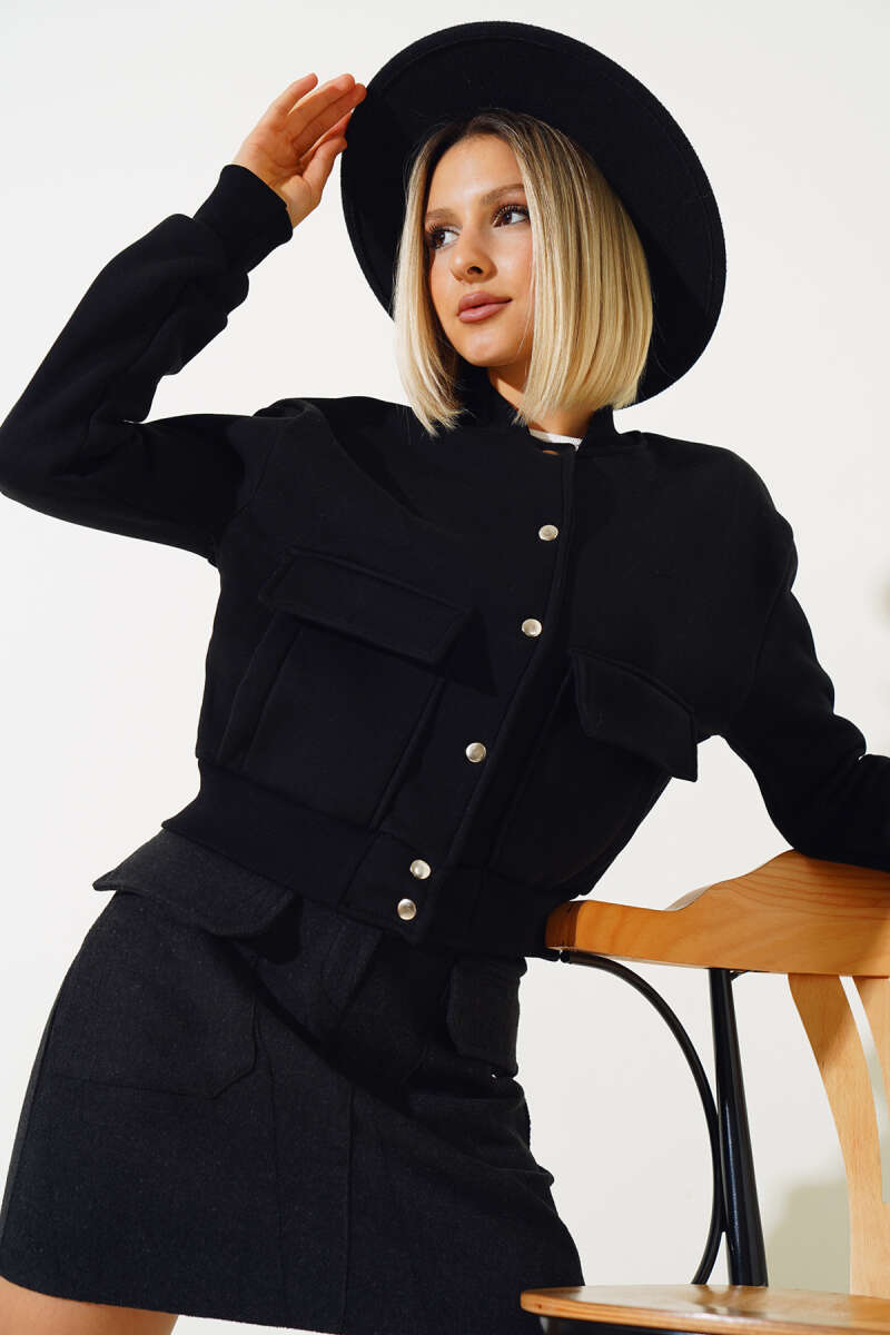 Peluş Yaka Kemerli Kaşe Panço Siyah