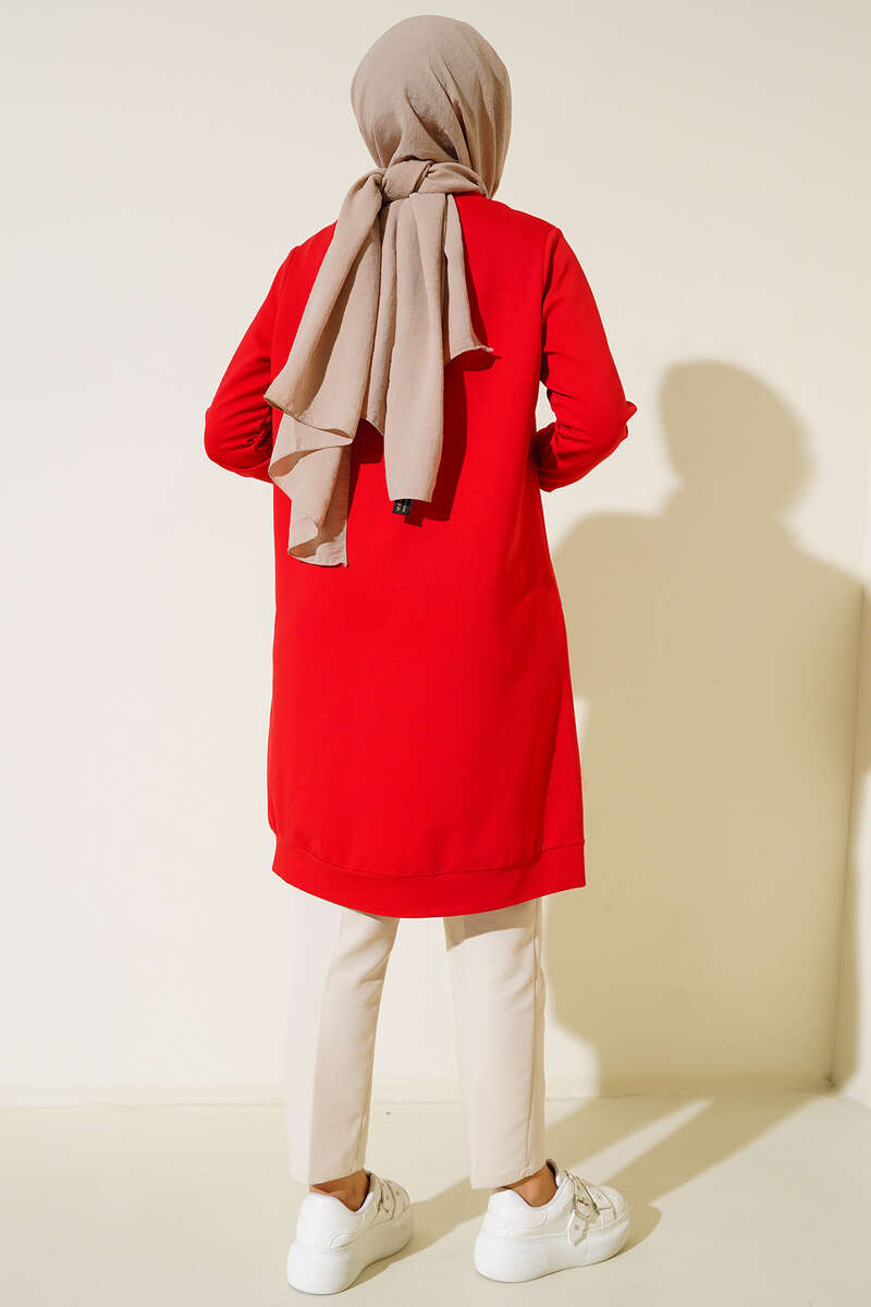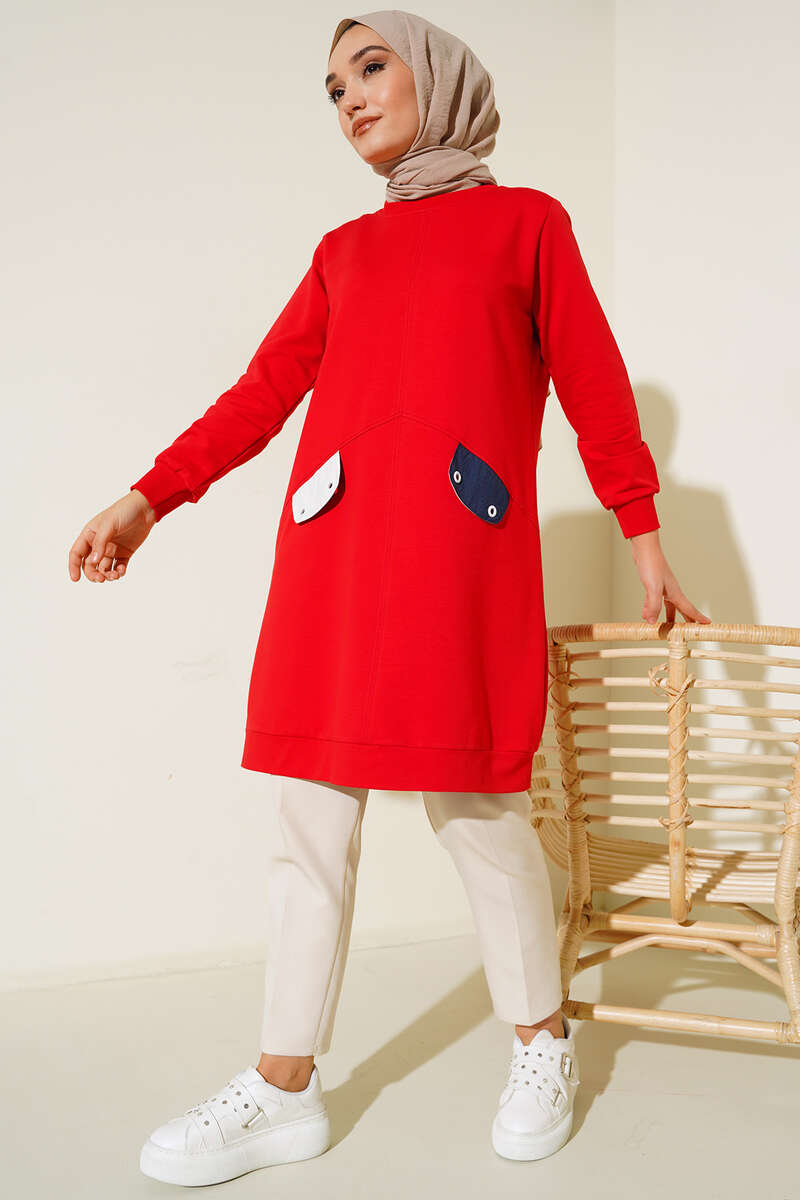 Tuniğimiz bisiklet yakalıdır Ürünümüzde dikiş detayları bulunmaktadır. İki yan kısmında süs cep kapakları mevcuttur ve bu ceplerde kuşgözü detayına sahiptir. Bilek kısımları ribanalıdır.