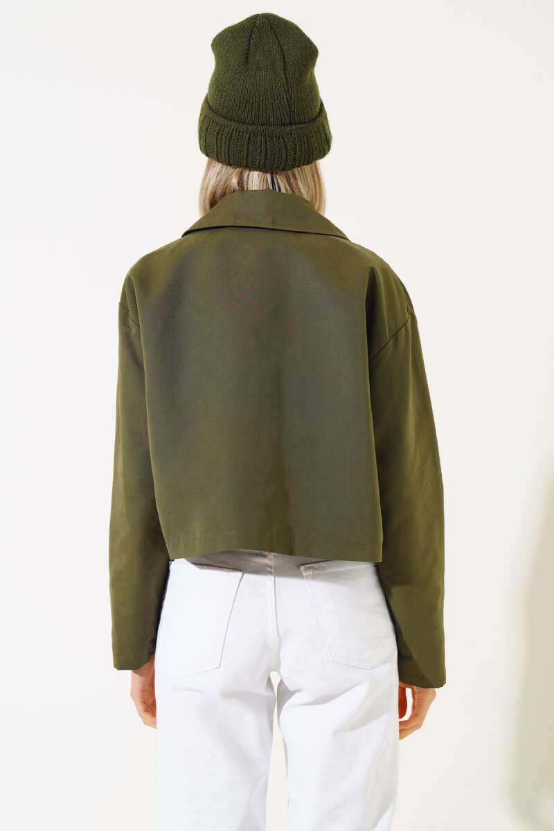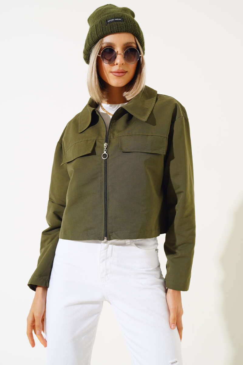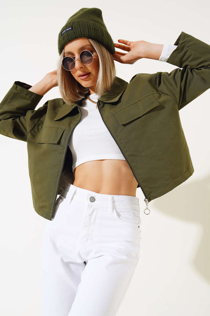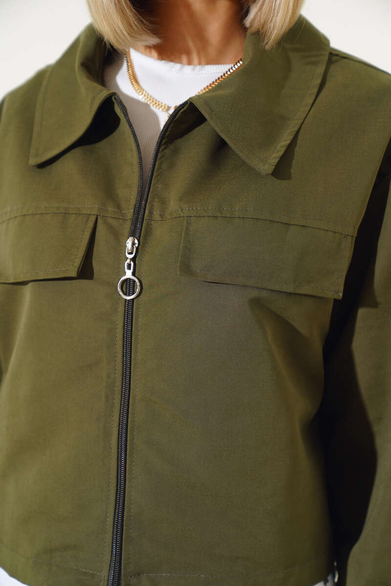 Cep Kapaklı Fermuarlı Kısa Ceket Haki
