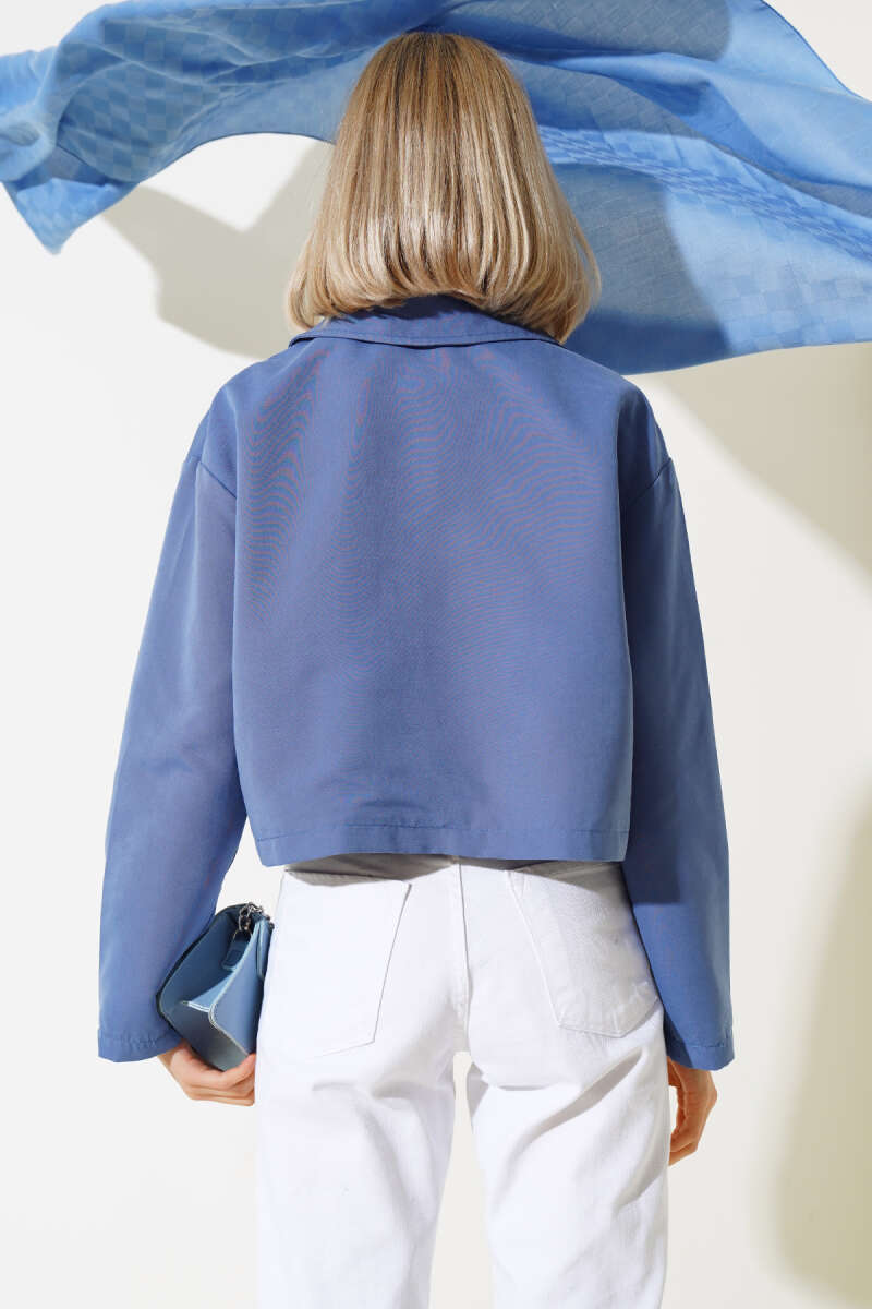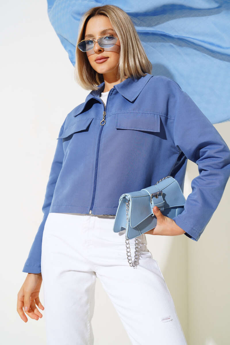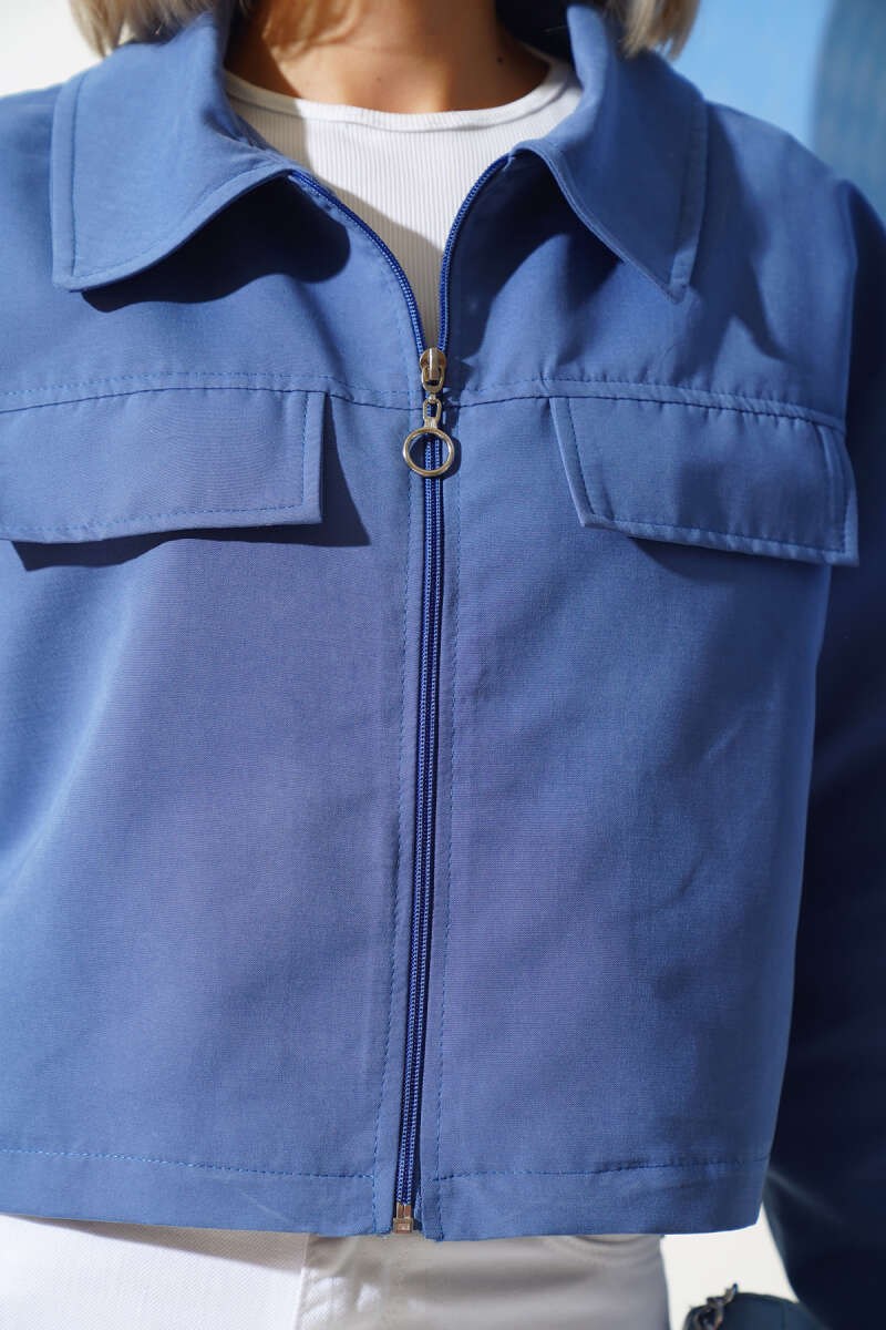 Cep Kapaklı Fermuarlı Kısa Ceket İndigo