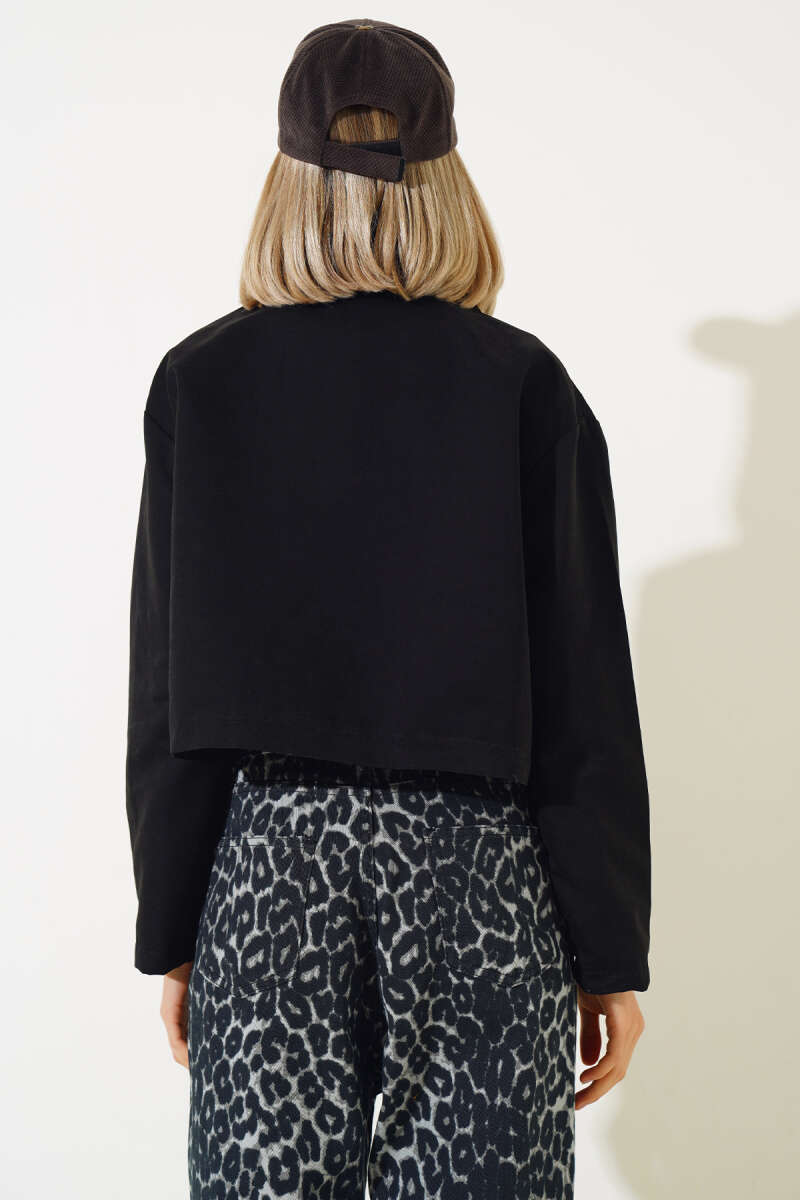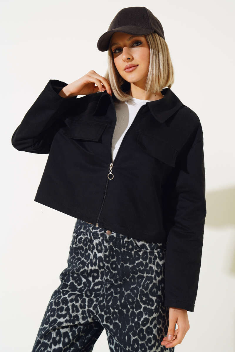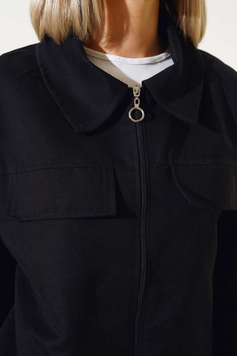 Cep Kapaklı Fermuarlı Kısa Ceket Siyah