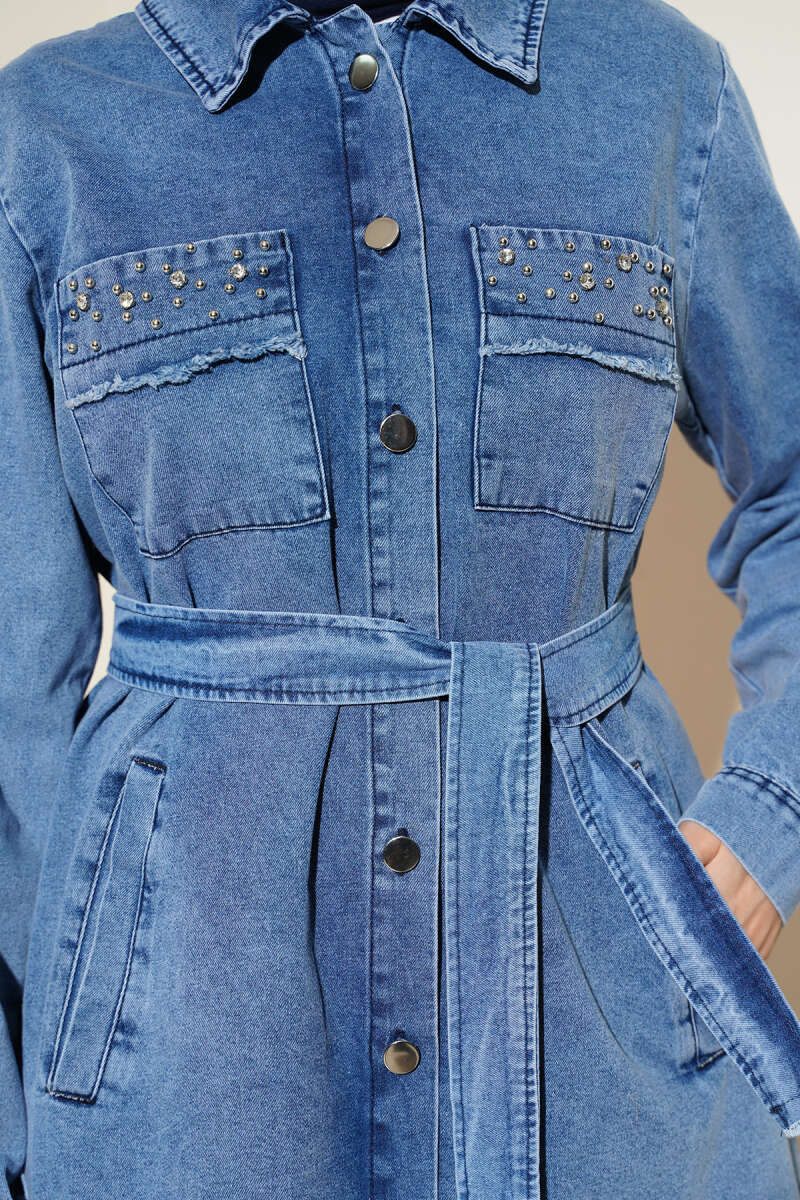 Yarım Yaka Fermuarlı Denim Elbise Lacivert