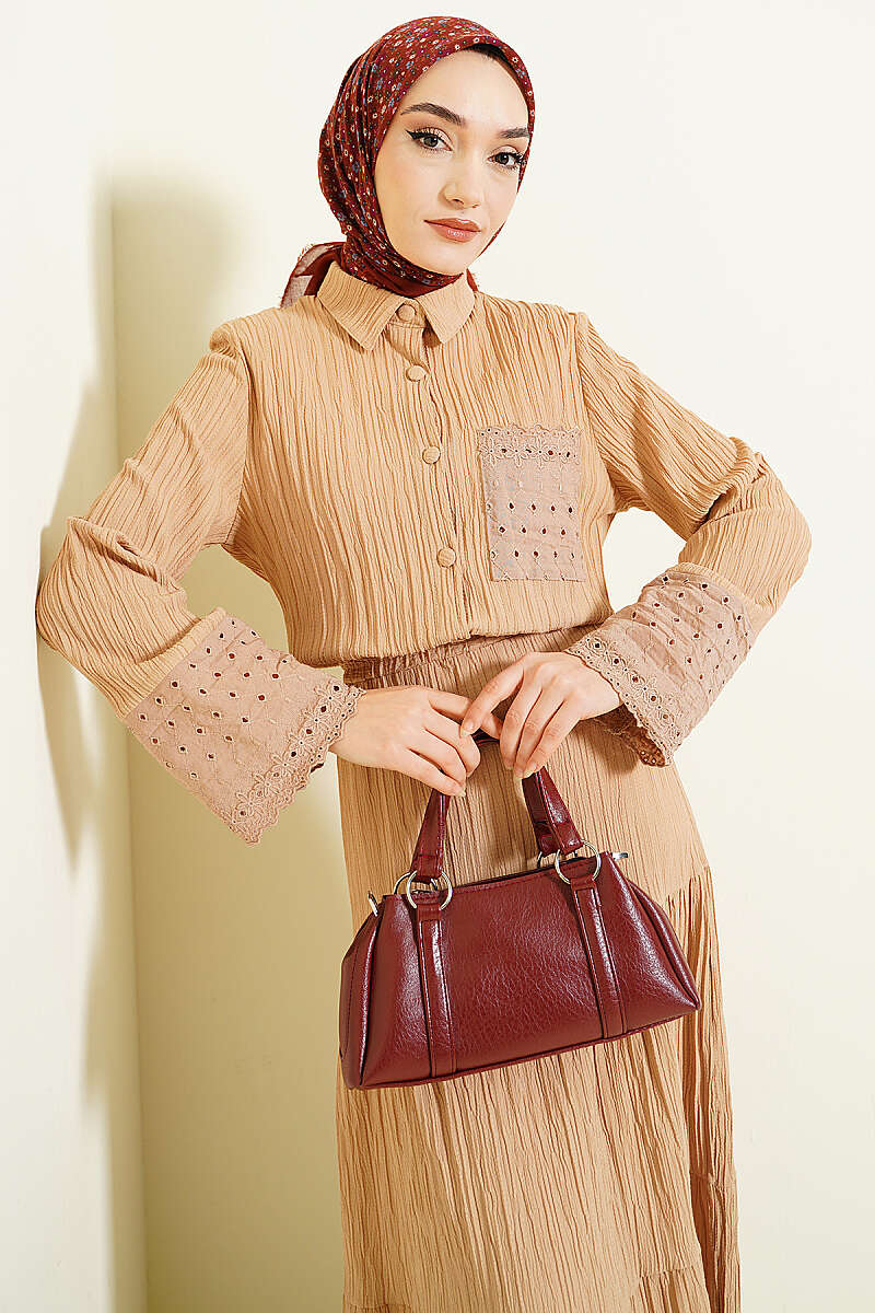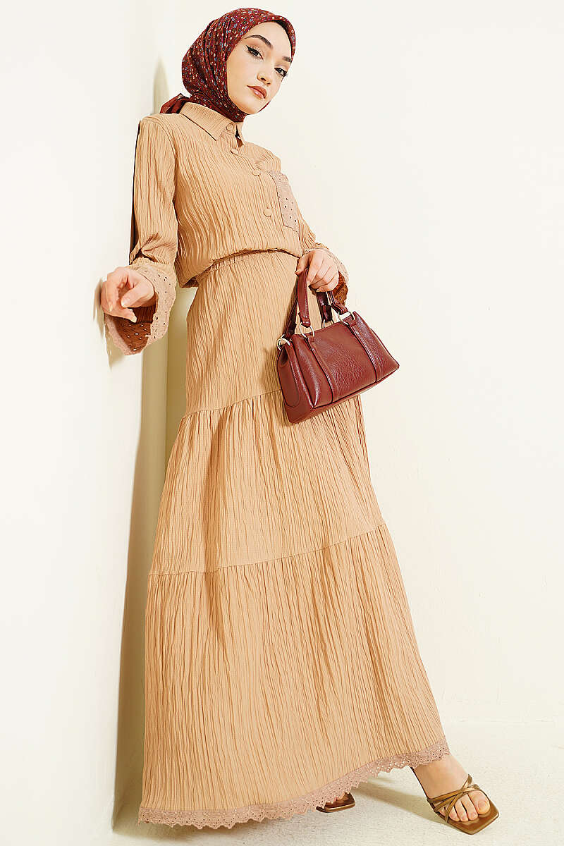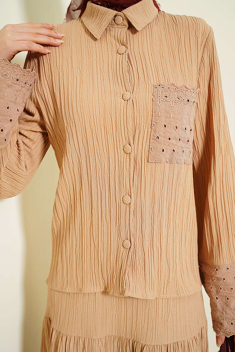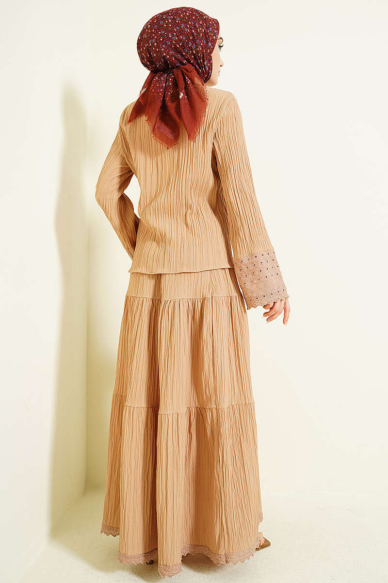 Cep ve Bilek Brodeli Krinkıl Etekli Takım Latte
