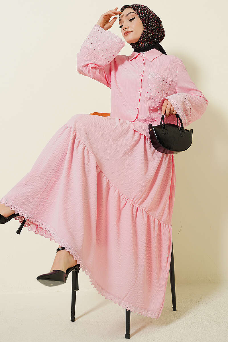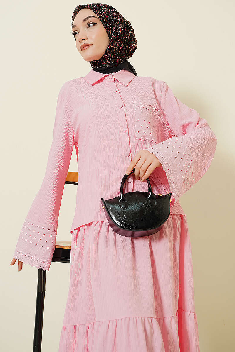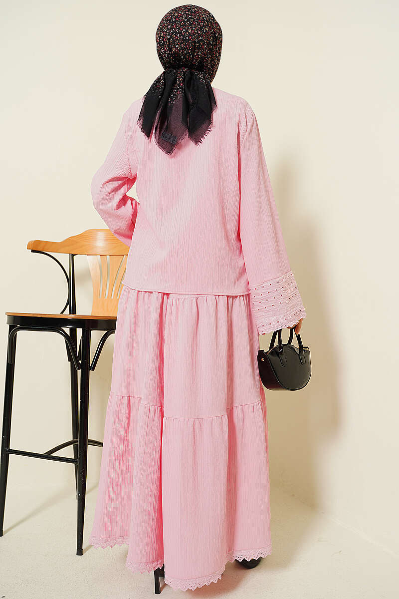 Cep ve Bilek Brodeli Krinkıl Etekli Takım Pembe