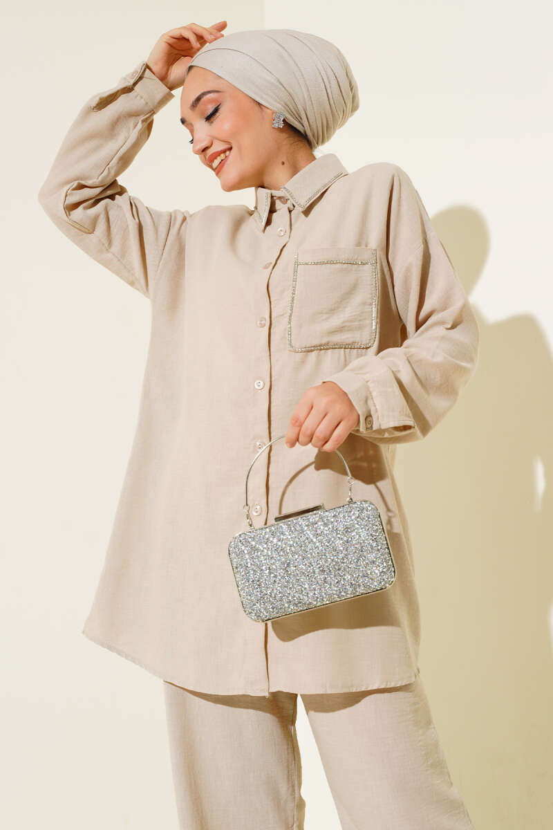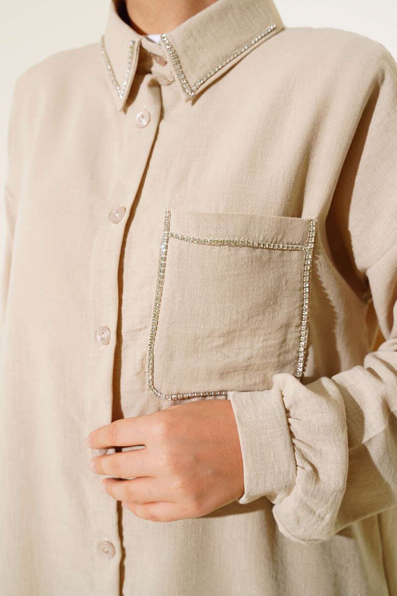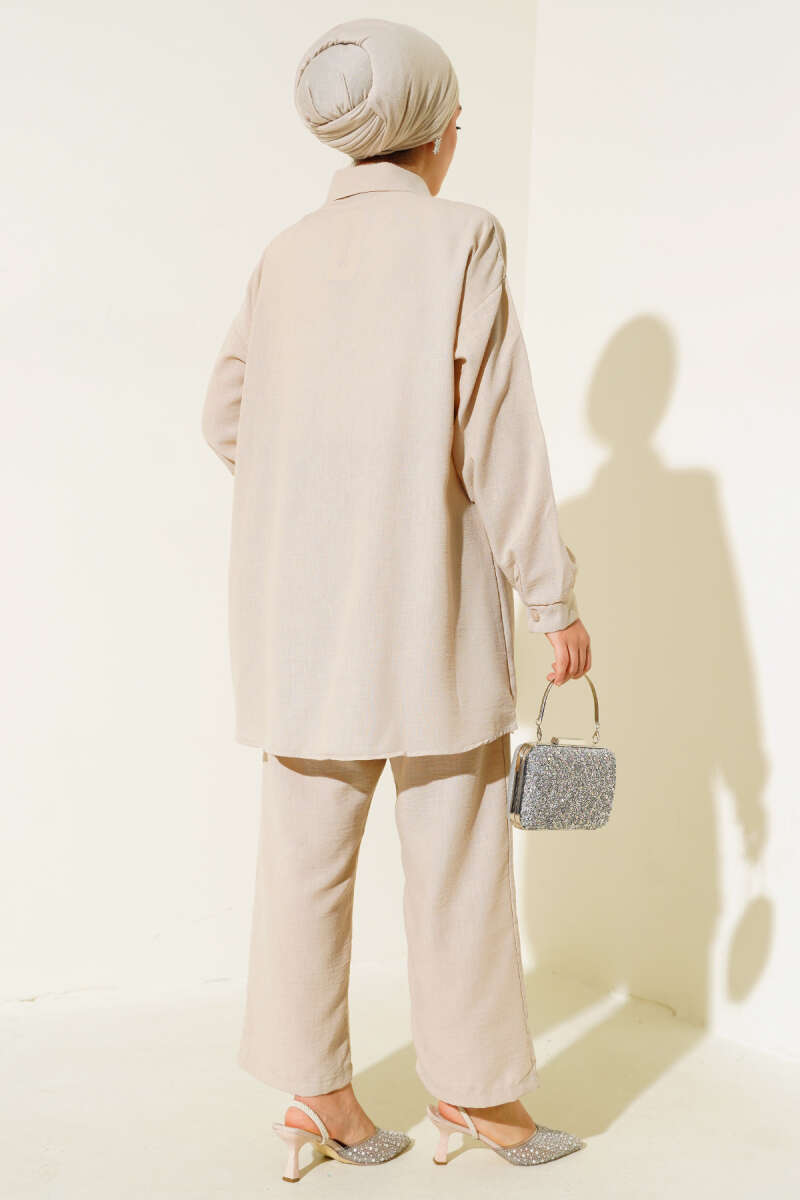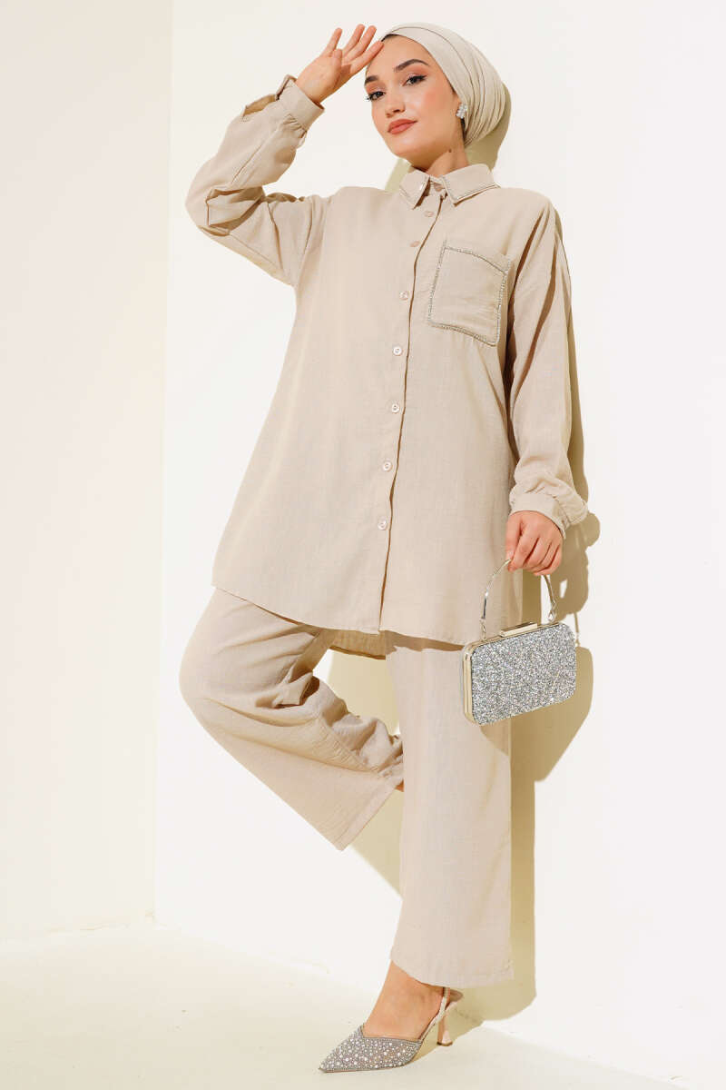 Cep ve Yaka Taşlı Keten İkili Takım Bej