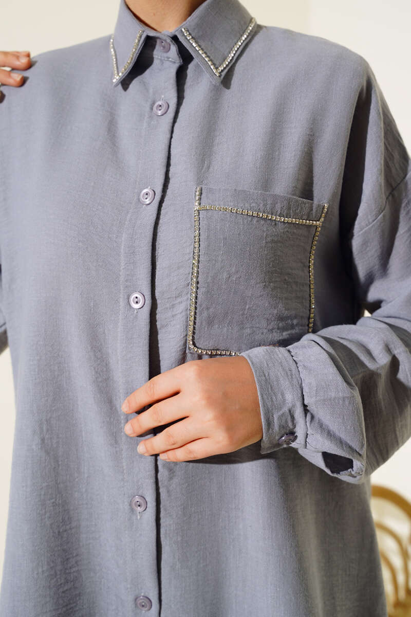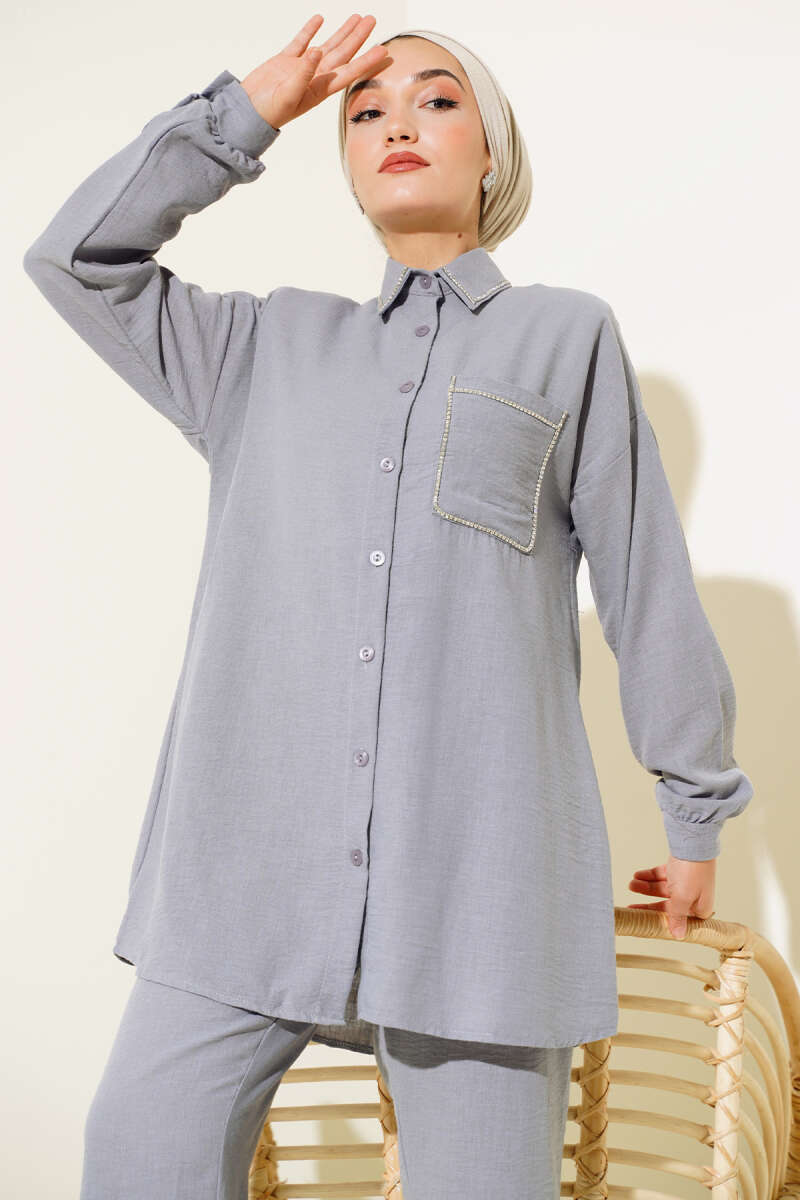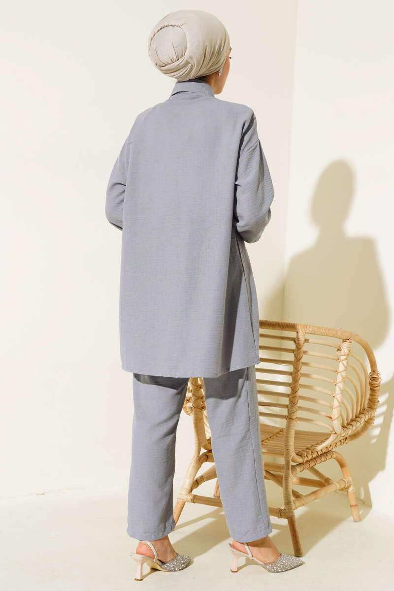 Önü Mini Düğmeli Elbise İkili Takım Füme