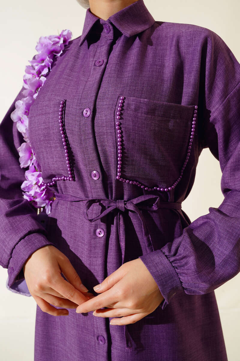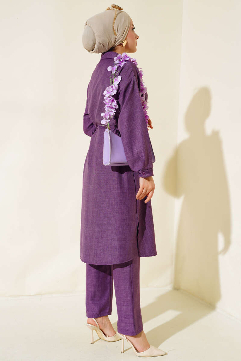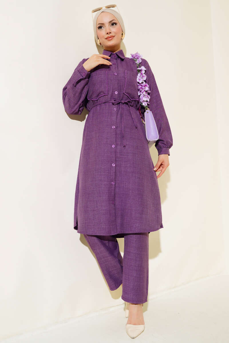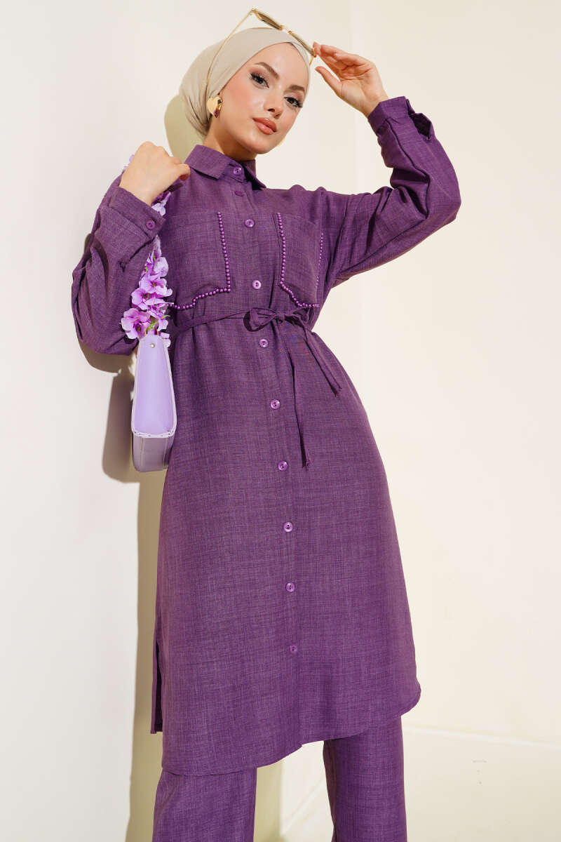 Yeni sezon ikili takımımız favorileriniz arasında girecektir. Tuniğimiz boydan düğmeli modeldir. Kendi kumaşından ip bağcığı vardır. Kol bilekleri manşetli ve düğmelidir. Göğsünde iki adet cebi vardır. Boncuk süslenmiştir. Etek uçları yırtmaçlıdır. Pantolonumuzun beli lastiklidir. Cepsiz modeldir. Geniş paçalıdır. Şık ve zarif ikili takımımız renk seçenekleriyle sizleri bekliyor.