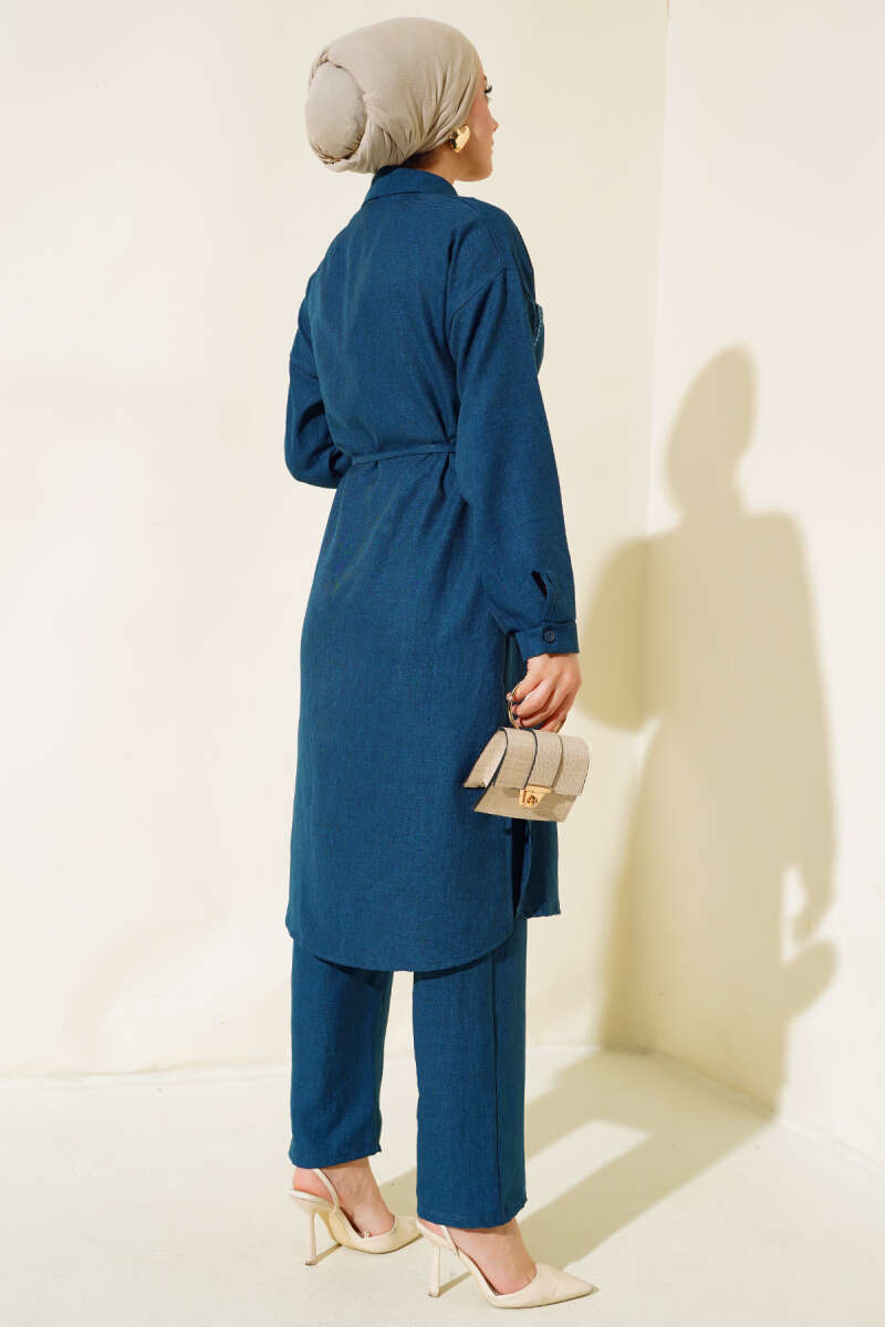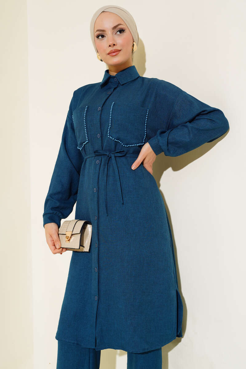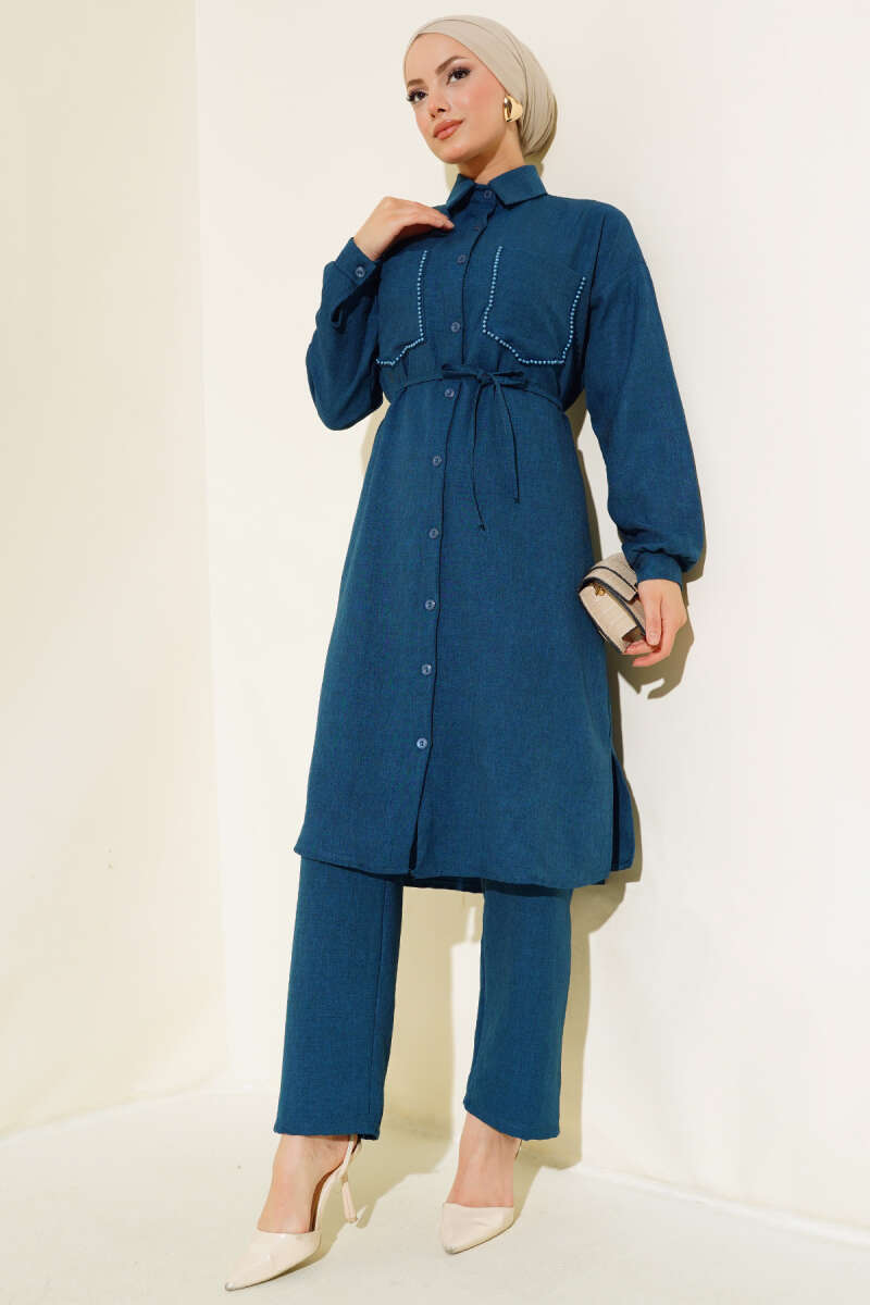 Yeni sezon ikili takımımız favorileriniz arasında girecektir. Tuniğimiz boydan düğmeli modeldir. Kendi kumaşından ip bağcığı vardır. Kol bilekleri manşetli ve düğmelidir. Göğsünde iki adet cebi vardır. Boncuk süslenmiştir. Etek uçları yırtmaçlıdır. Pantolonumuzun beli lastiklidir. Cepsiz modeldir. Geniş paçalıdır. Şık ve zarif ikili takımımız renk seçenekleriyle sizleri bekliyor.