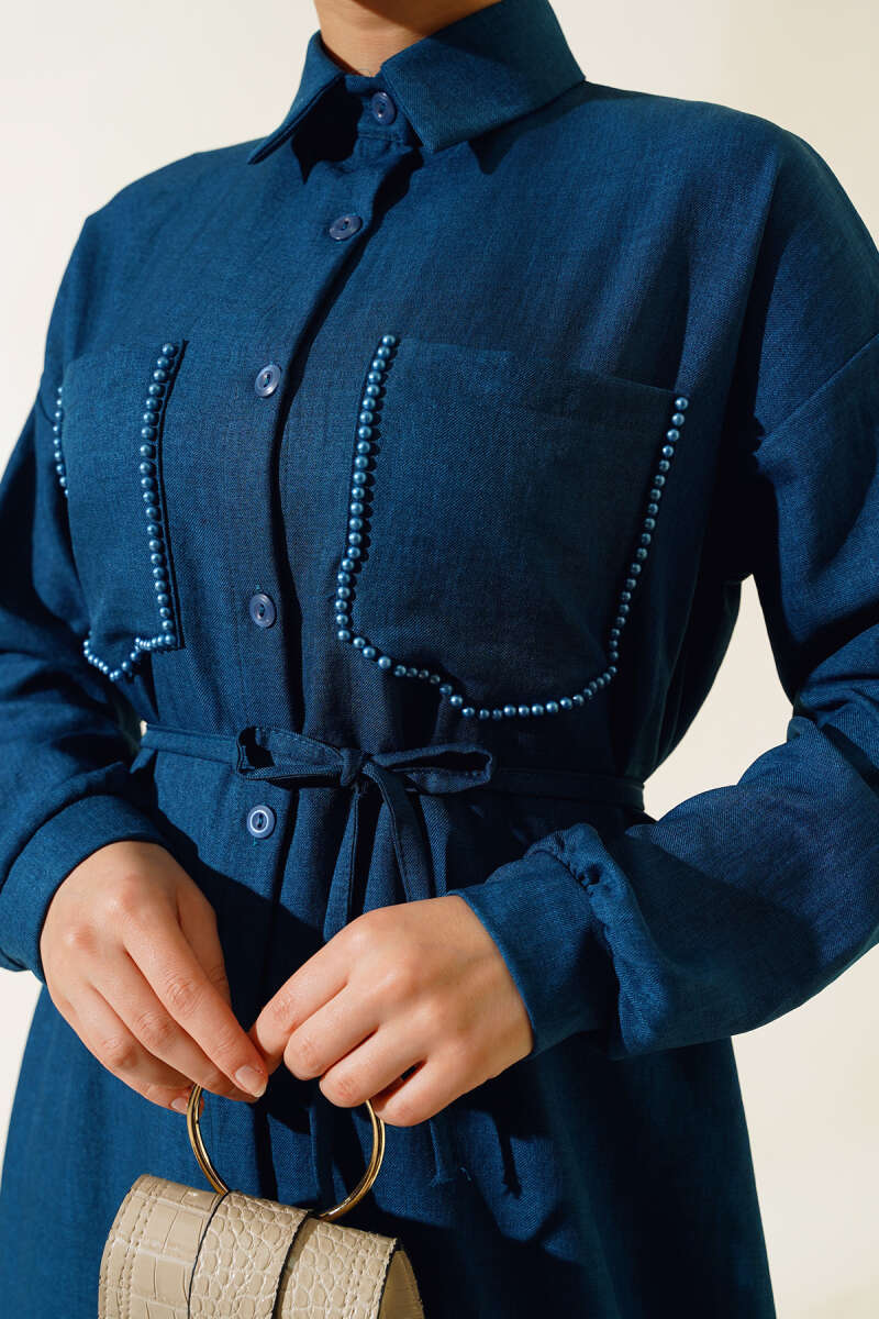 Cepleri Boncuklu Keten İkili Takım Petrol