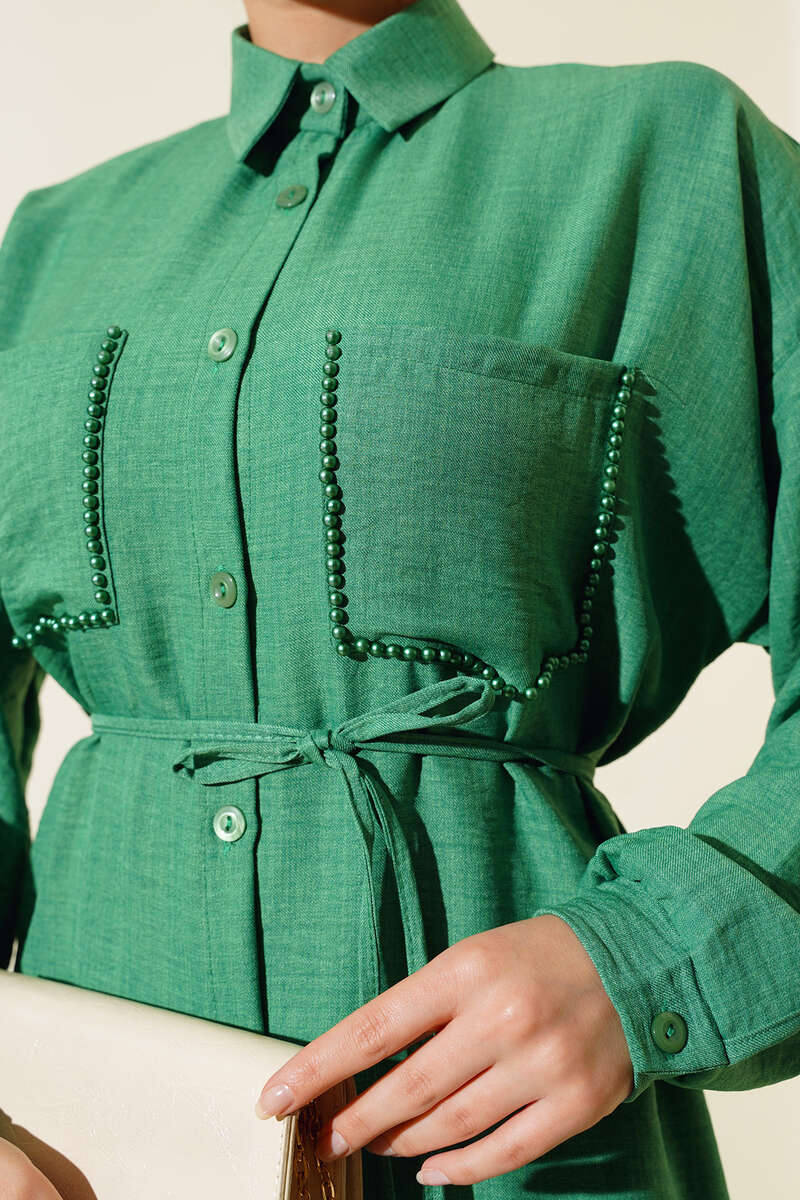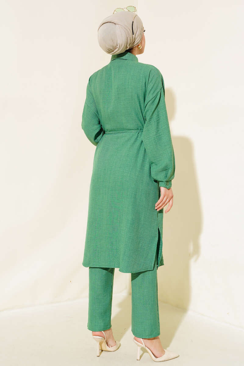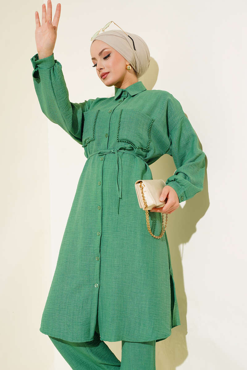 Cepleri Boncuklu Keten İkili Takım Yeşil