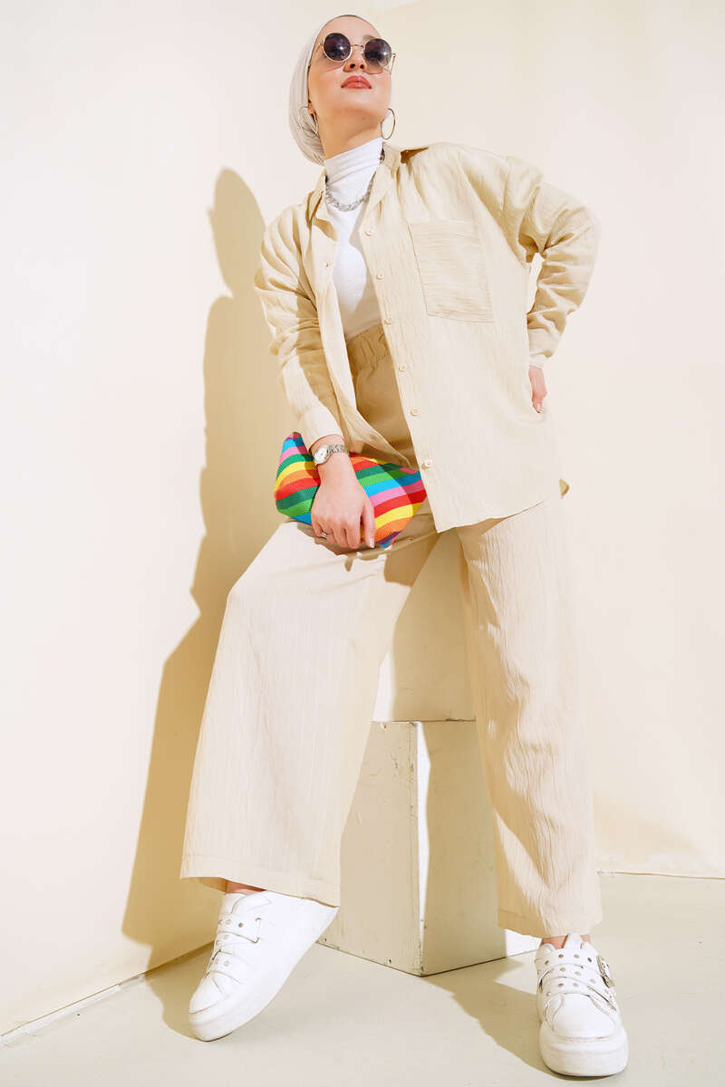 Yeni sezon ikili takım modelimiz sizlerle. Gömleğimiz boydan düğmelidir. Bir adet cebi bulunur. Kol bilekleri düğmelidir. Salaş bir yapıya sahiptir. Pantolonumuzun beli lastikli ve iplidir. Pantolonumuz cepsizdir. Paçası bol paçadır. Takımımız çizgi desenlidir. Rahat kalıbı ve duruşuyla çok beğeneceksiniz. Renk seçeneklerimiz mevcuttur.
