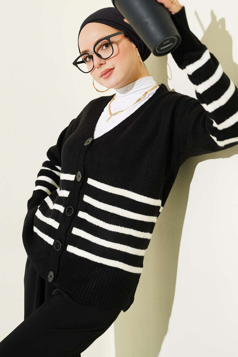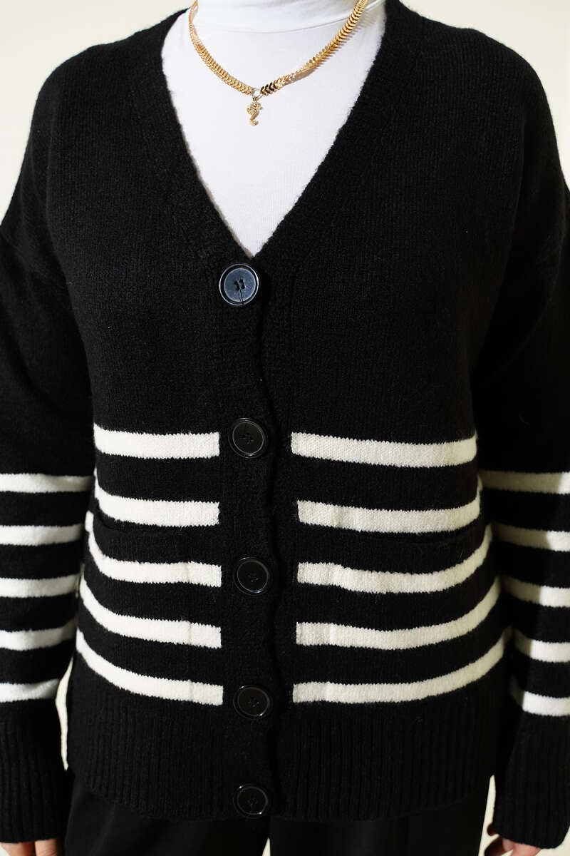 Cepli Çizgi Detaylı Triko Hırka Ekru
