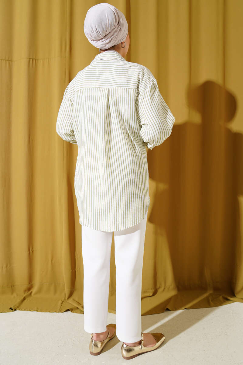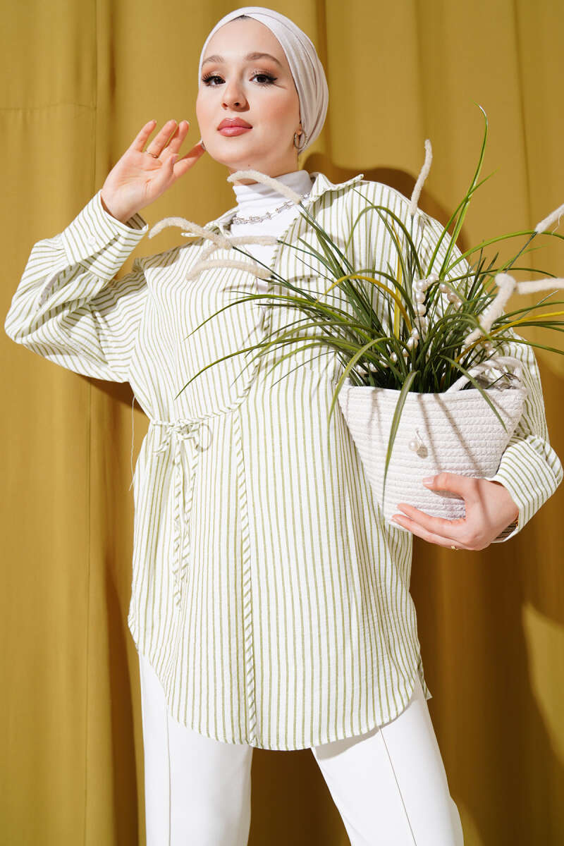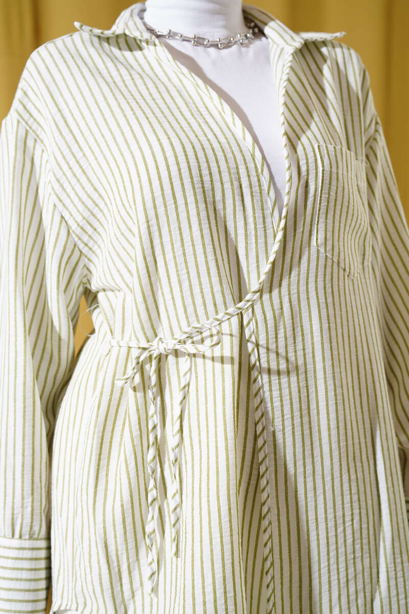 Cepli Çizgili Yandan İp Bağlamalı Kimono Haki