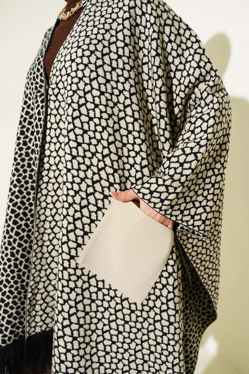 Kilim Desen Kapüşonlu Panço Siyah Kahve