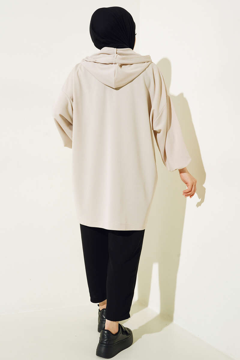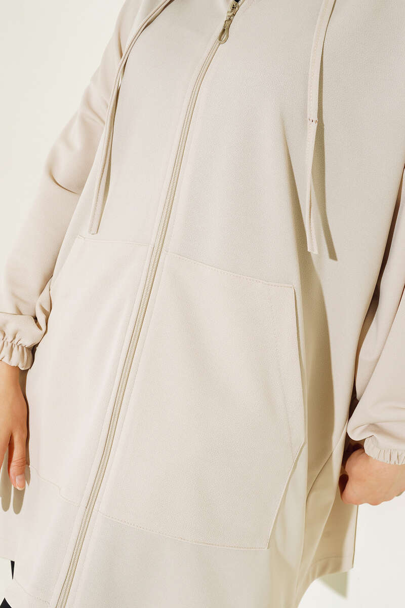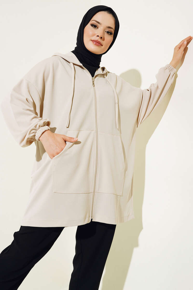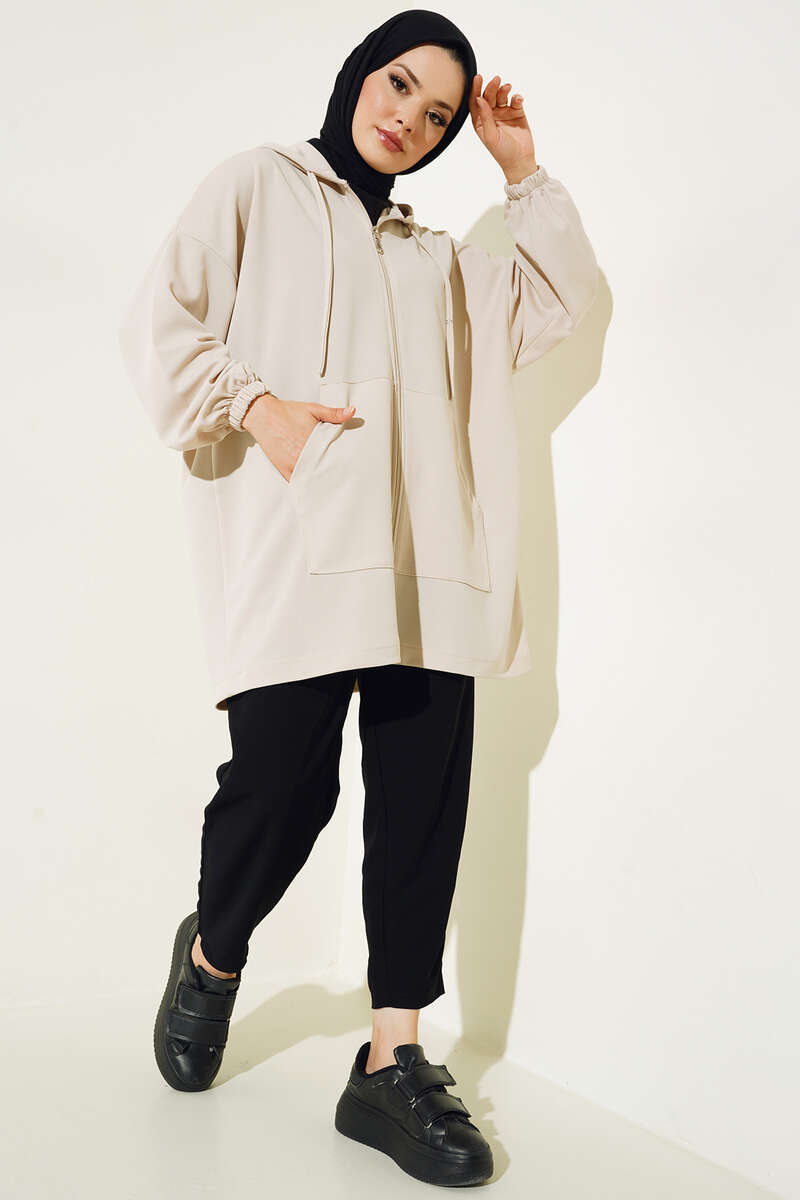 Yeni sezon hırkamız boydan fermuarlıdır. Önünde bulunan iki adet cebi kullanılabilmektedir. Kapüşonlu hırkamızın kapüşonu ip bağlamalıdır. Düşük omuz model olan hırka kombinlerinizin tamamlayıcı parçası olacaktır.
