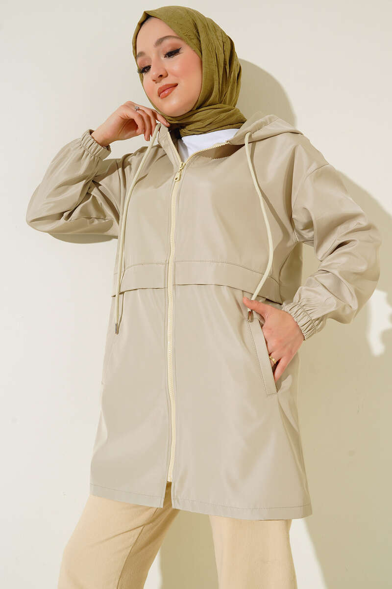 Yeni sezon trençkot boydan fermuarlıdır. Düşük omuz salaş model olan trençkotumuzun bilekleri lastiklidir. İki adet cebi kullanılabilmektedir. Kapüşonlu trençkotumuzun kapüşonu ip bağlamalıdır. İçi astarsızdır.