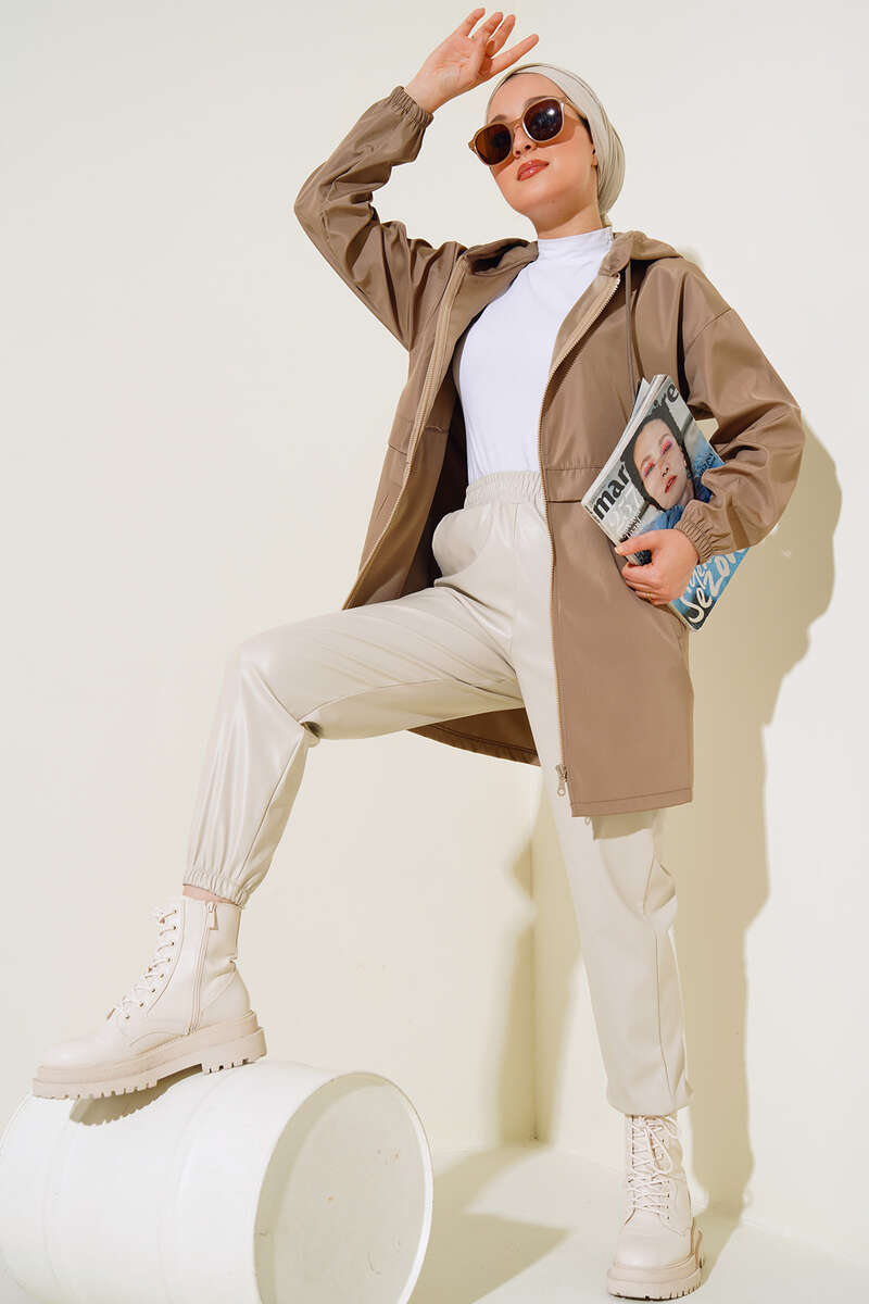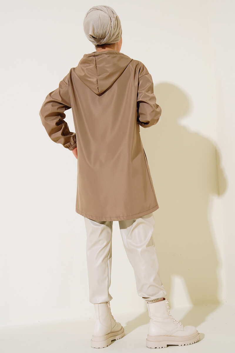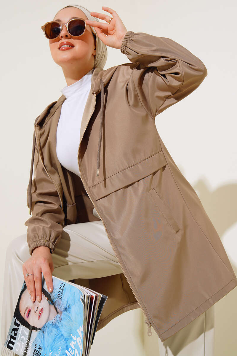 Cepli Fermuarlı Kapüşonlu Trençkot Vizon